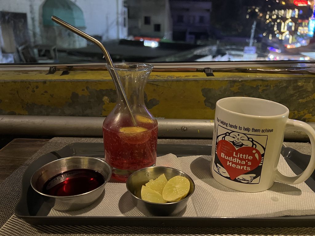 When we first turned up the staff said food wasn’t available but as we went to leave the chef and owner turned up so all was fine. We ordered some vegan burgers with fries and some sodas. Food was delicious. I liked how you could make the rose soda to your own liking/strength and it came with a big bottle of soda so was good value. We sat on the balcony overlooking the market which was good for people/animal watching and parades going by (wedding season)
