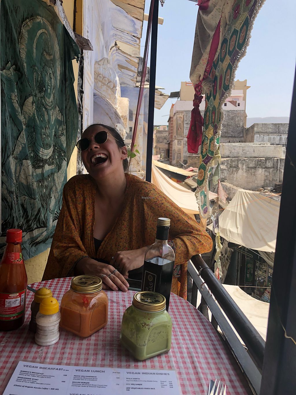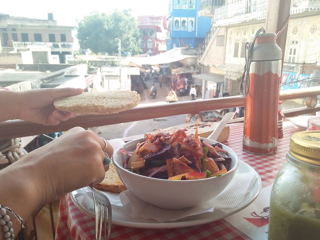 Fabulous upstairs veggie cafe in Pushkar with separate vegan menu. I have so far tried the delicious light pakoras, the coconut curry, the veg sabjee and the amazing Oreo milkshakes.