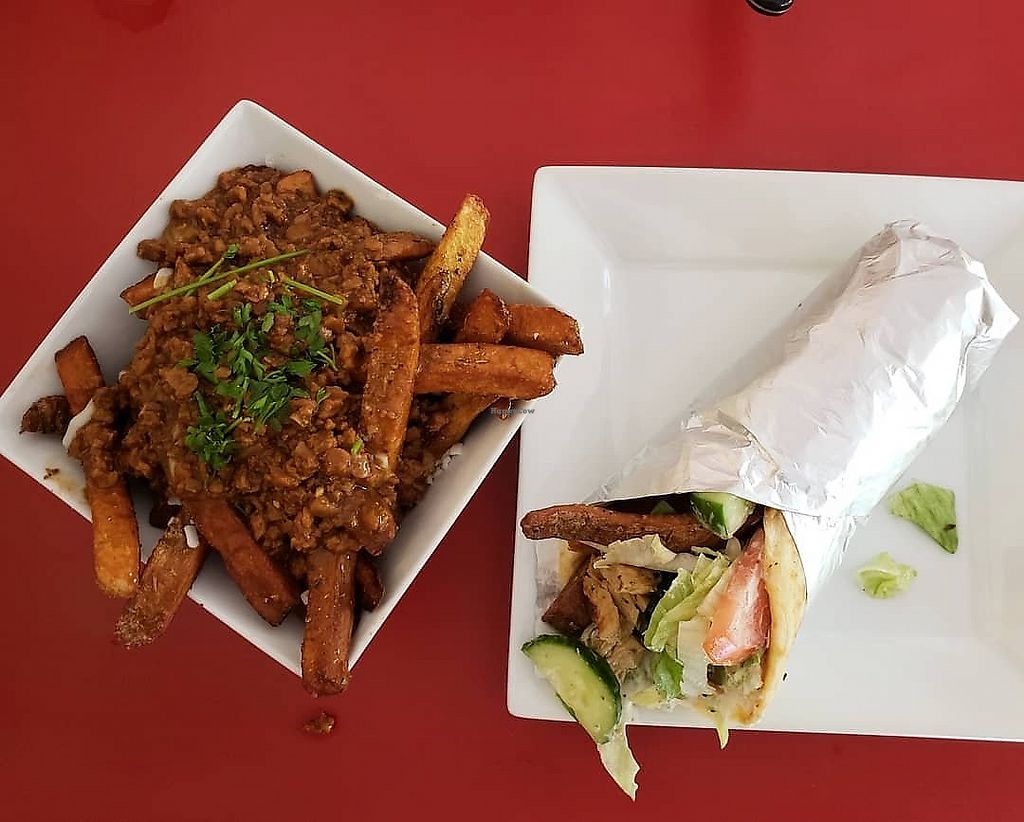 Chick'n wrap with chili poutine