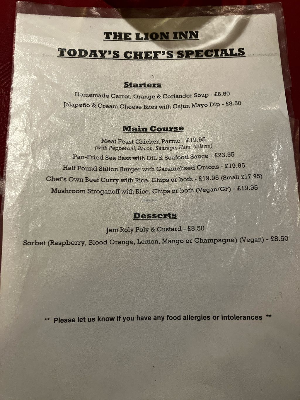 This is in a lovely location literally in the middle of moors. The menu had a few vegan meal items. I can also confirm that they had vegan dessert on the menu. I also noted some vegan items on the daily specials menu. For main meals there was a burger and a butter bean sweet potato and spinach stew. I chose the stew. It was a hearty home-made type stew that was filling and delicious. Seemed pricey at over £18 but the portion size is generous. It comes with thick cut chips, peas and salad. My mother and I shared the meal and there was enough stew left over for me to have for lunch the following day (you can get a takeaway box from them).