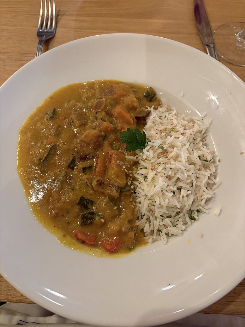 I had the seitan feijoadinha with tomato (no mint Chips were included, came with rice). It was ok but a little bland, definately not worth 18€. Koriander was involved.