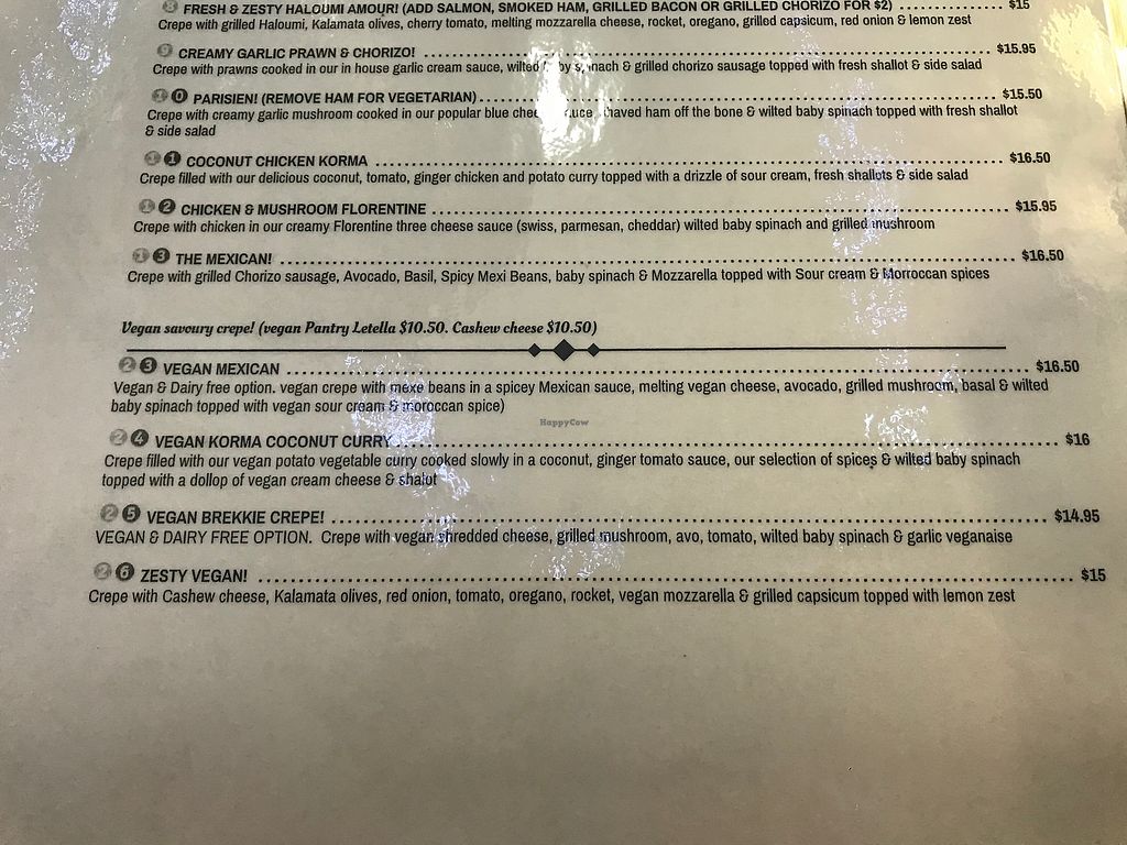 Welcoming, very friendly little place with great variety of crepes. Lots of vegan options. We got a vegan mango and coconut and the vegan breaky crepe with a vegan rocky road milkshake. All very tasty. Would definitely go back.
