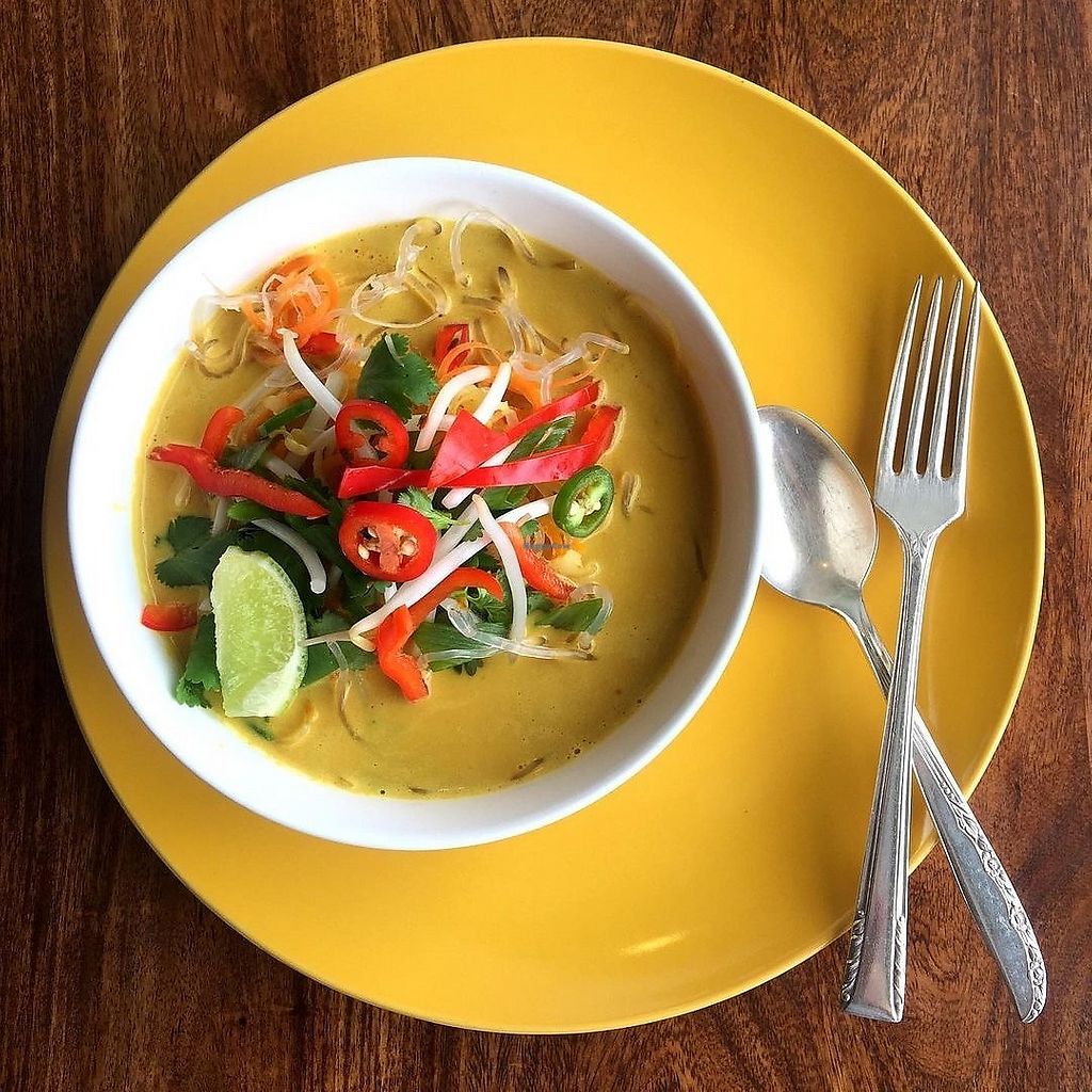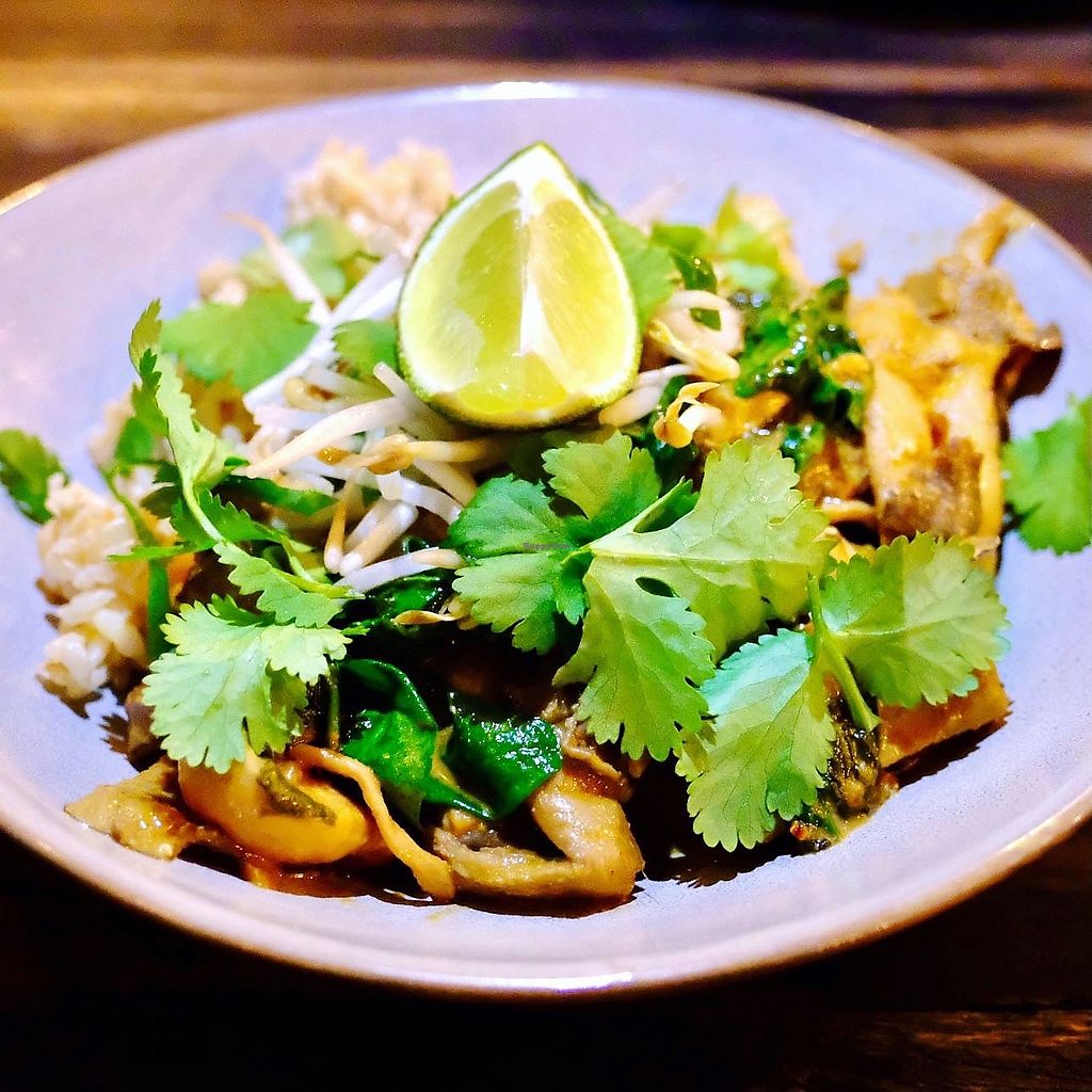 🌱Oyster Mushroom Tofu Red Curry- Local oyster mushrooms tofu in red chili, lemongrass, galangal, with bean shoots, spring onion, coriander, biodynamic Australian grown brown rice.