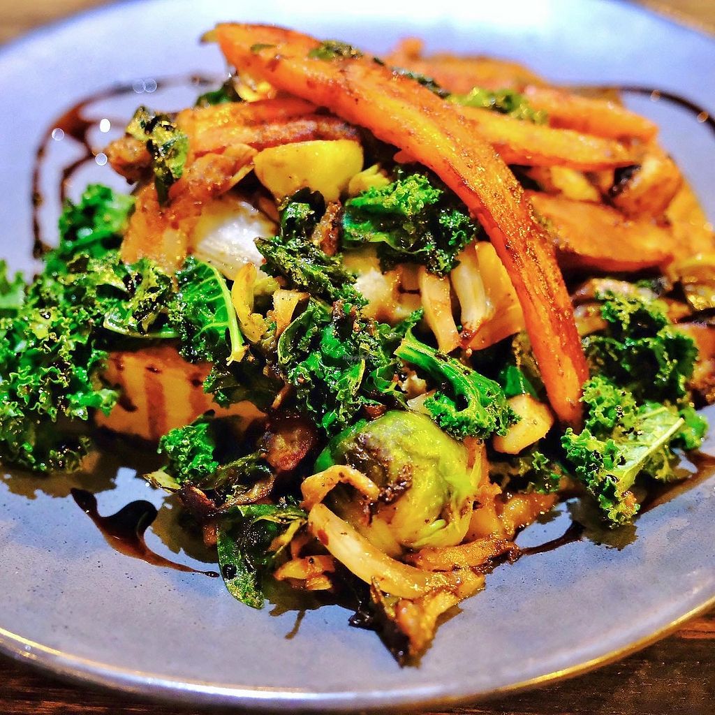 🌱Baked Polenta- with roasted Brussels sprouts, baby carrots, fennel, parsnip, red wine glaze, onion gravy.