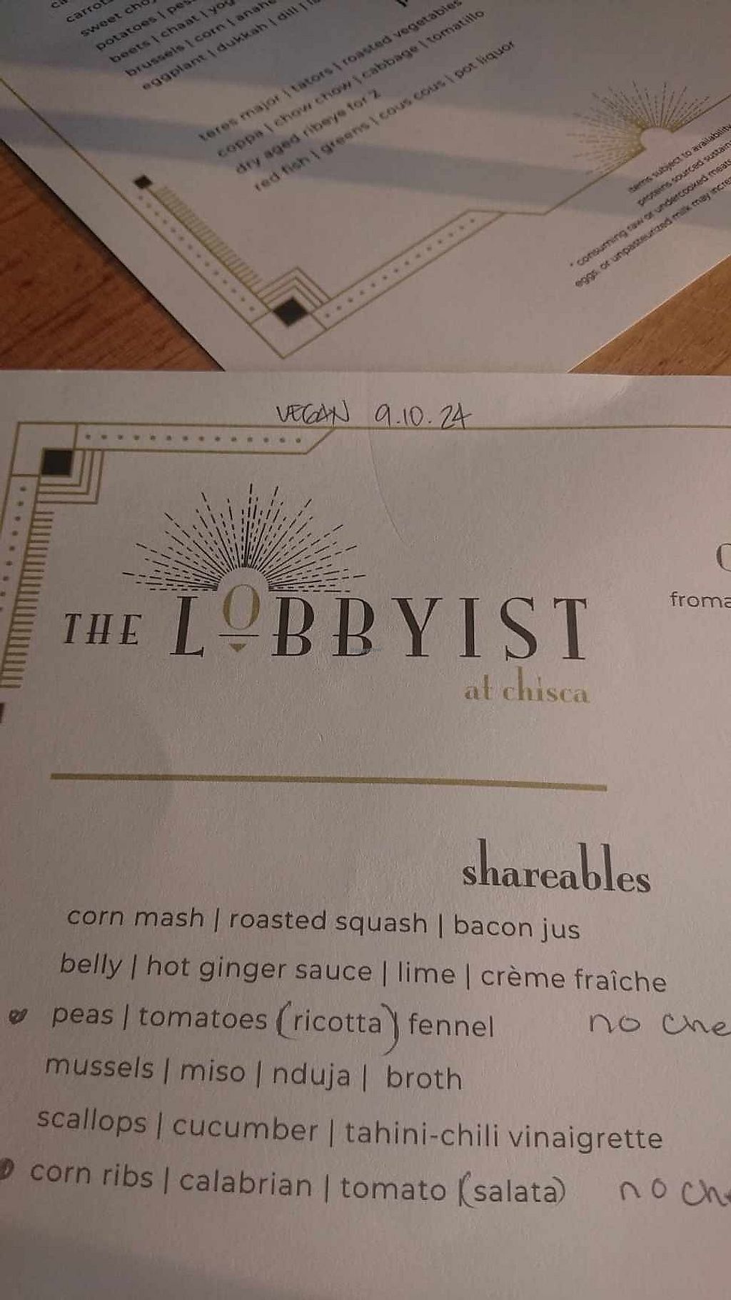 The venue is beautiful. The service is the best we've had in Memphis. When asking if there were vegan options we were presented with a modified menu and a woman who was prepared to cope with any inquiries. The only thing we noted is that a stand alone protein such as lentils, tofu is not on the menu. Since this is a sourced locally type of place I can see that happening. I could not make up my mind but had narrowed it down to two. The server suggested an charcuterie plate and we ended up splitting that for our meal. It was healthy and delicious.