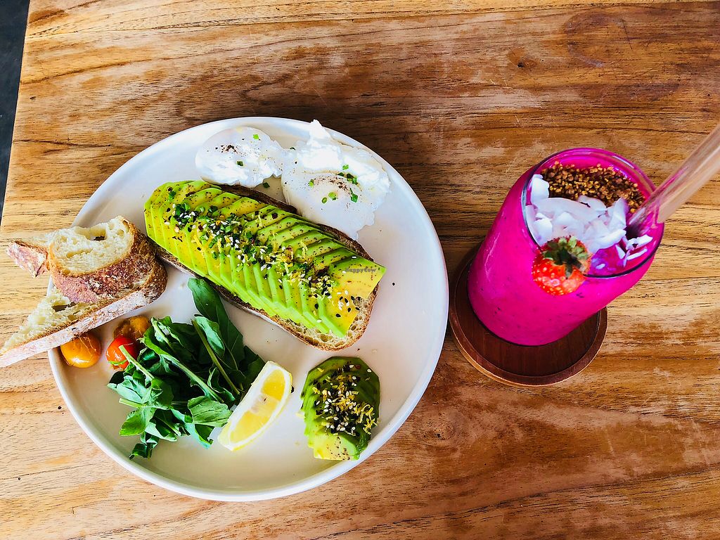 Avo On Toast w/ Poached Eggs + Pink Dragon