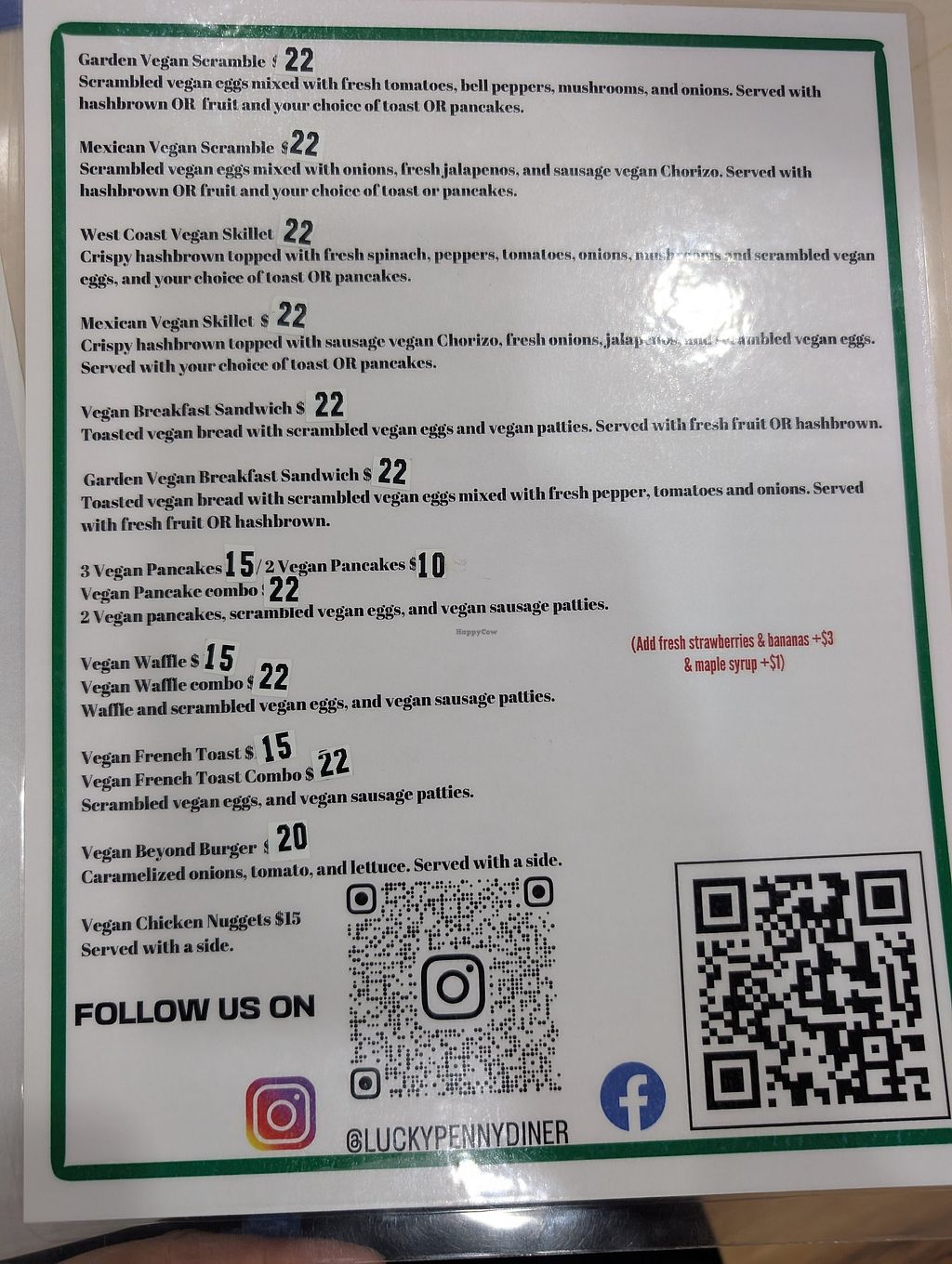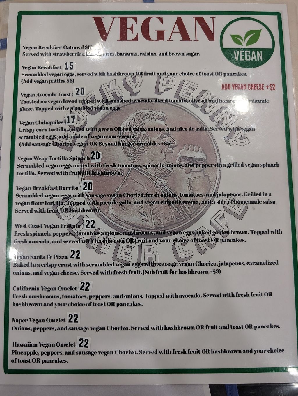The Lucky Penny Diner has an extensive vegan menu, as well as a non-vegan traditional diner menu, and a separate gluten-free menu. Most options include scrambles, omelettes, frittatas, and skillets made with Just Egg, fresh veggies, and beyond chorizo. We had the Santa Fe Pizza (a savory vegan breakfast pizza with scrambled just egg, vegan chorizo, onions, and green chilis (very tasty!) and the West Coast skillet. The skillet had fresh, flavorful veggies atop crispy hashbrowns with a blanket of Just Egg on top. There are lots of sides and most dishes come with fruit or toast, or a pancake. They also have pancake, waffle, and French toast options. As others have mentioned, the pancakes were not the best. They were fine as a side, but did not have much rise to them and perhaps too much egg replacer. I would try the French toast or waffles in the future. BYO to-go container for any leftovers as they only have styrofoam take out boxes.