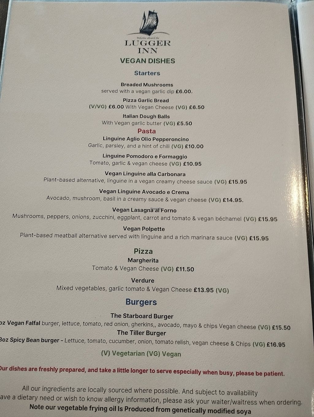 I was surprised to see lots of vegan options for pasta and pizza dishes and a vegan burger (looked like a standard seaside restaurant). Garlic bread was vegan too with option for vegan cheese on top. There were a couple of vegan cakes also (had chocolate sponge).