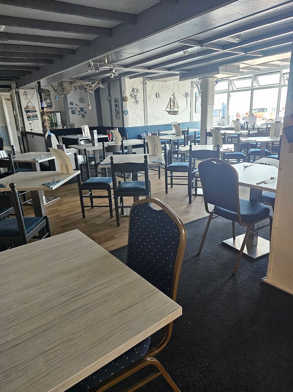 Serves meat, vegan options available. Restaurant located within a beachfront hotel. Vegan items are clearly labeled and may include: burger with fries, garlic pizza bread, brucchetta, meatballs, linguine aglio olio pepperoncino, and lasagne. Italian night on Friday. Carvery on Sunday with vegan options available. Open Mon-Thu 18:00-21:00, Fri 17:30-21:00, Sat 18:00-21:00, Sun 12:00-18:00.