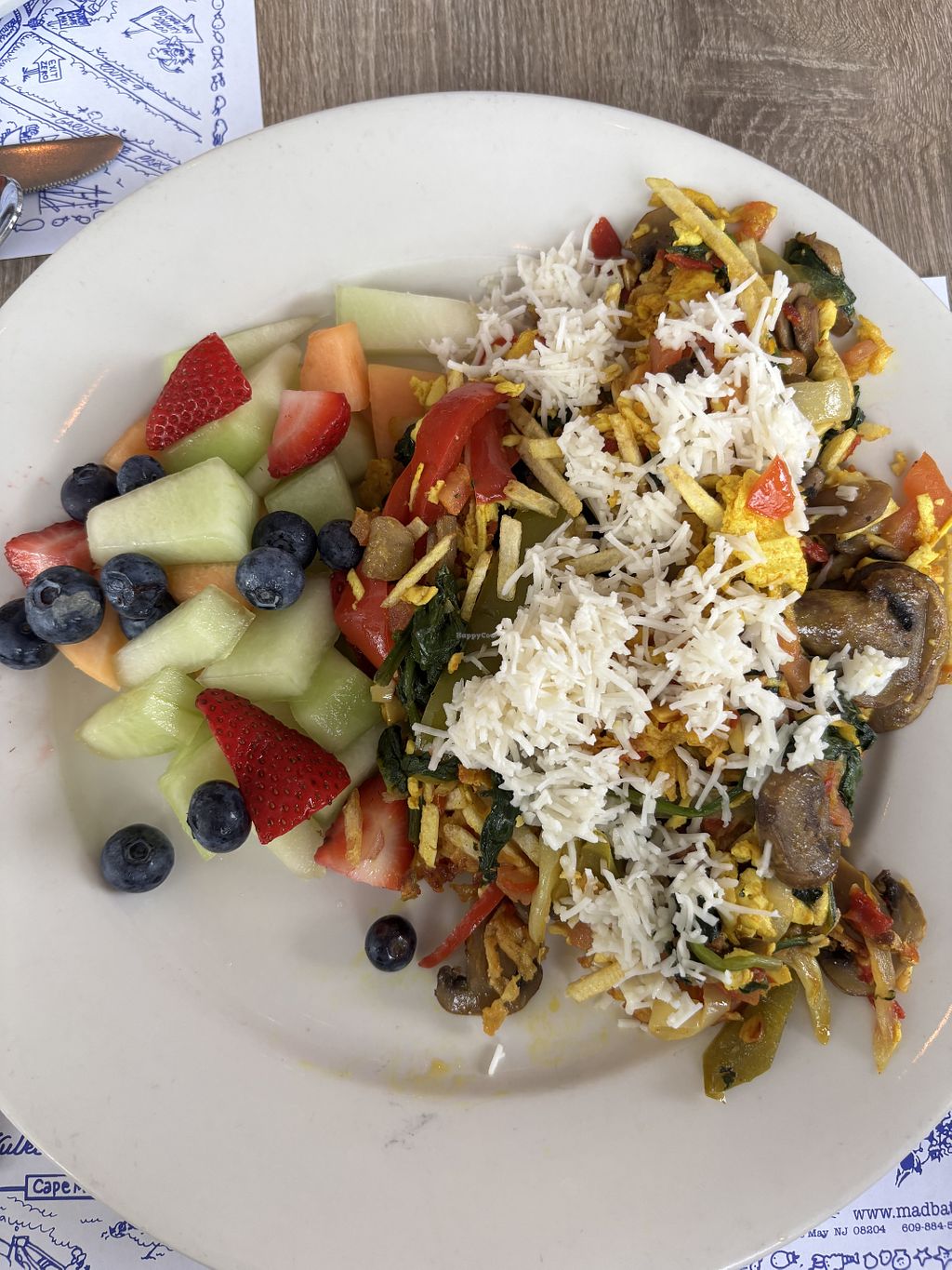 Cute restaurant on the porch of a small hotel. Cape May seems to be a vegan desert so this was a beautiful place to eat. Wait was 25 min for 2 on a Sat morning in May. Well worth it. We tried the vegan scramble and the vegan blt. Both were served with fruit on the side which was a nice mix of melon and berries. The scramble had plenty of veggies, shaved tofu and potatoes with vegan cheese sprinkled on top. The BLT on a bagel was excellent as well with tempeh bacon. There were plenty of other options as well and we would gladly go back!