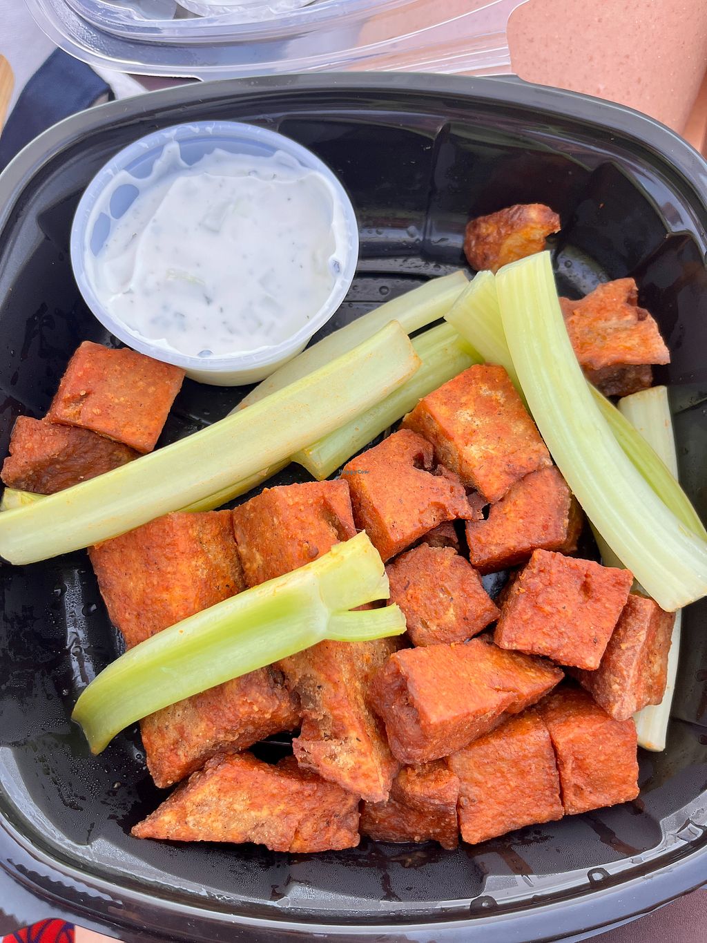 We got lunch takeout from Mad Batter. To us the lunch menu, while pricy, seemed like the better option for variety in vegan entrees. We got the seitan wings, chick’n cheesesteak, and vegan pizza. The wings were the best by far. They were spicy and well cooked. The vegan pizza had veggies and vegan chick’n and was well received by the child. The cheesesteak was also delicious. The meal was a bit pricier than how we usually dine. But the food was worth it.