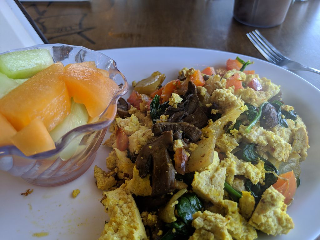 I hunted for coffee near where I was and found the Mad Batter. Imagine my surprise to see a separate vegan options list on the menu (not shown on the online version as of this writing). I ordered scrambled tofu and an almond milk mocha, iced. Every bite freshly made and delicious. Friendly fast service.