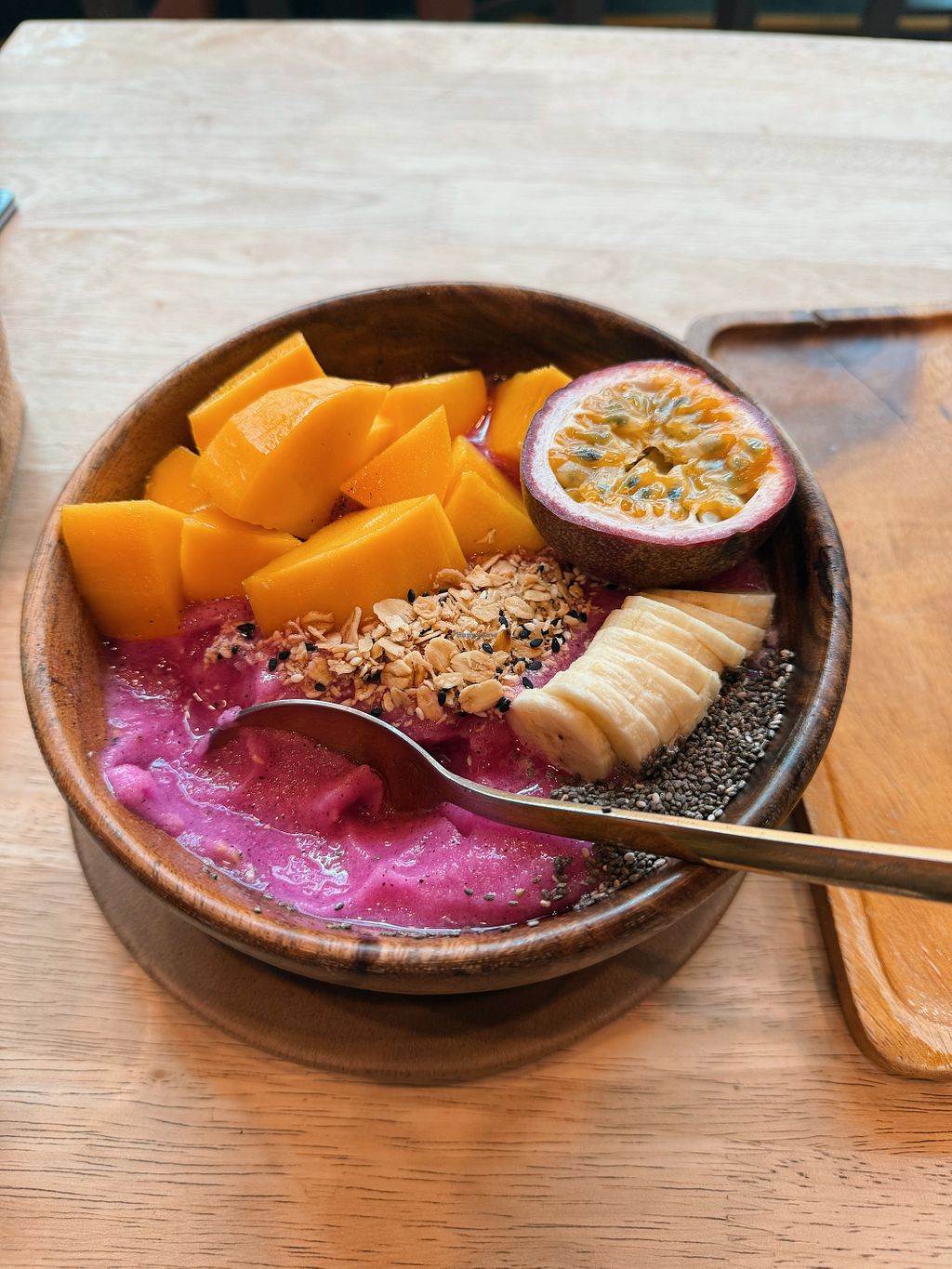Read moreWe tried mango black sticky rice, coconut pudding with ice cream, peanut butter, banana and muesli in oat milk, sourdough bread (without butter) with beans and fries.