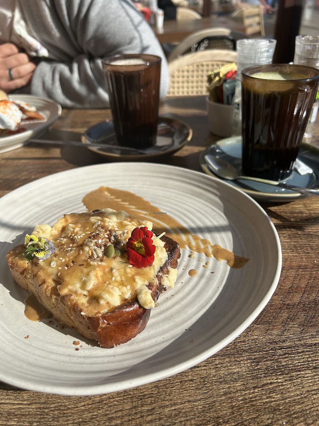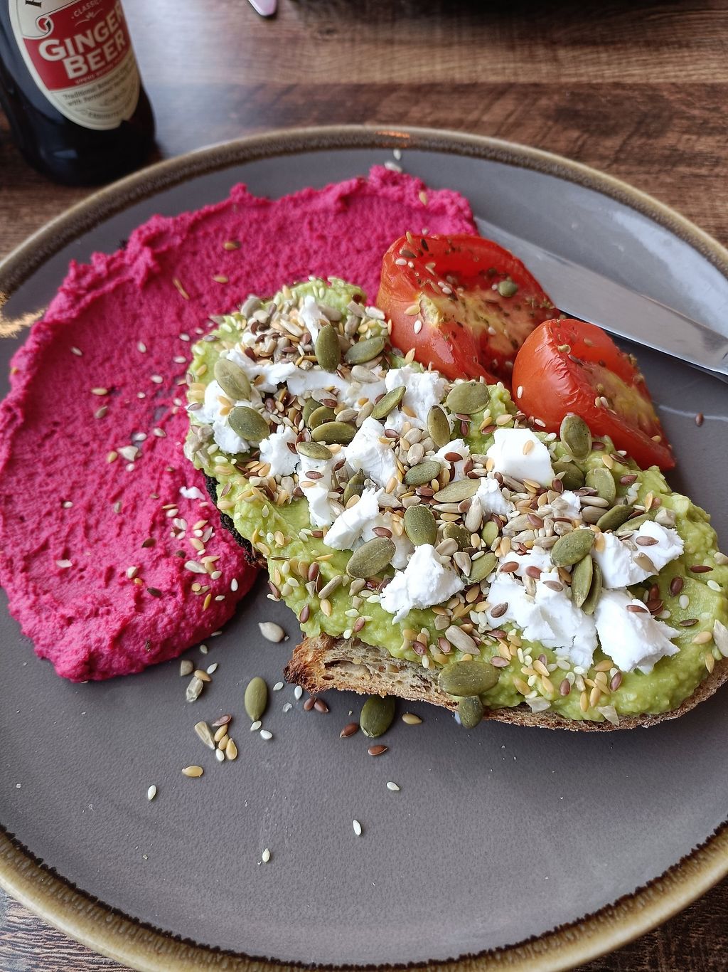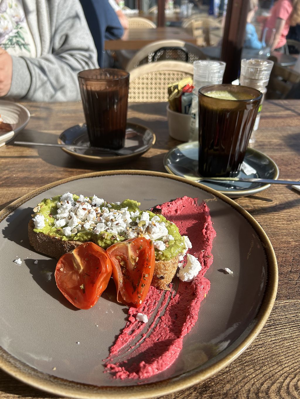 It was great that they had vegan options but I feel the breakfast was a weird selection of items. It included : field mushroom, avocado, beans, roasted tomato, beet hummus and one slice of toasted sourdough. Which wasn't enough for the wet ingredients . I had smashed avocado on toast with a side of beet hummus, again there was only one slice of bread , which the avocado was on, so nothing to eat the hummus with. I ordered another slice of sourdough from the extra list and was charged for a round of toast with jam instead. Which I didn't order or want . This place is ok if like us you are hungry and options are limited.
