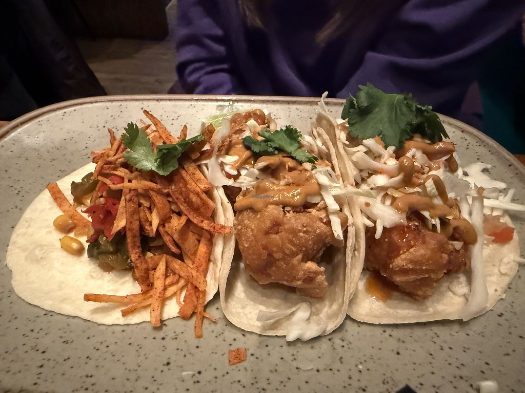 Baja Cauliflower taco on the left; Mole Chickpea and Zucchini taco in…