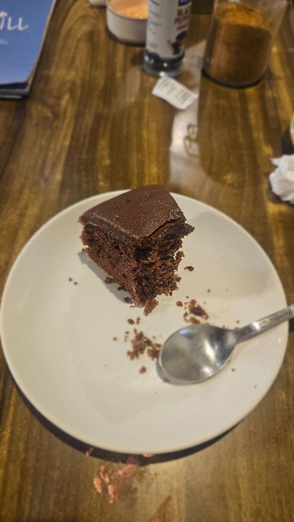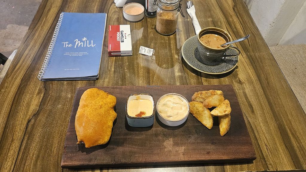 I had the 'Fish' and chips (eggplant), chocolate cake and vegan chai. …