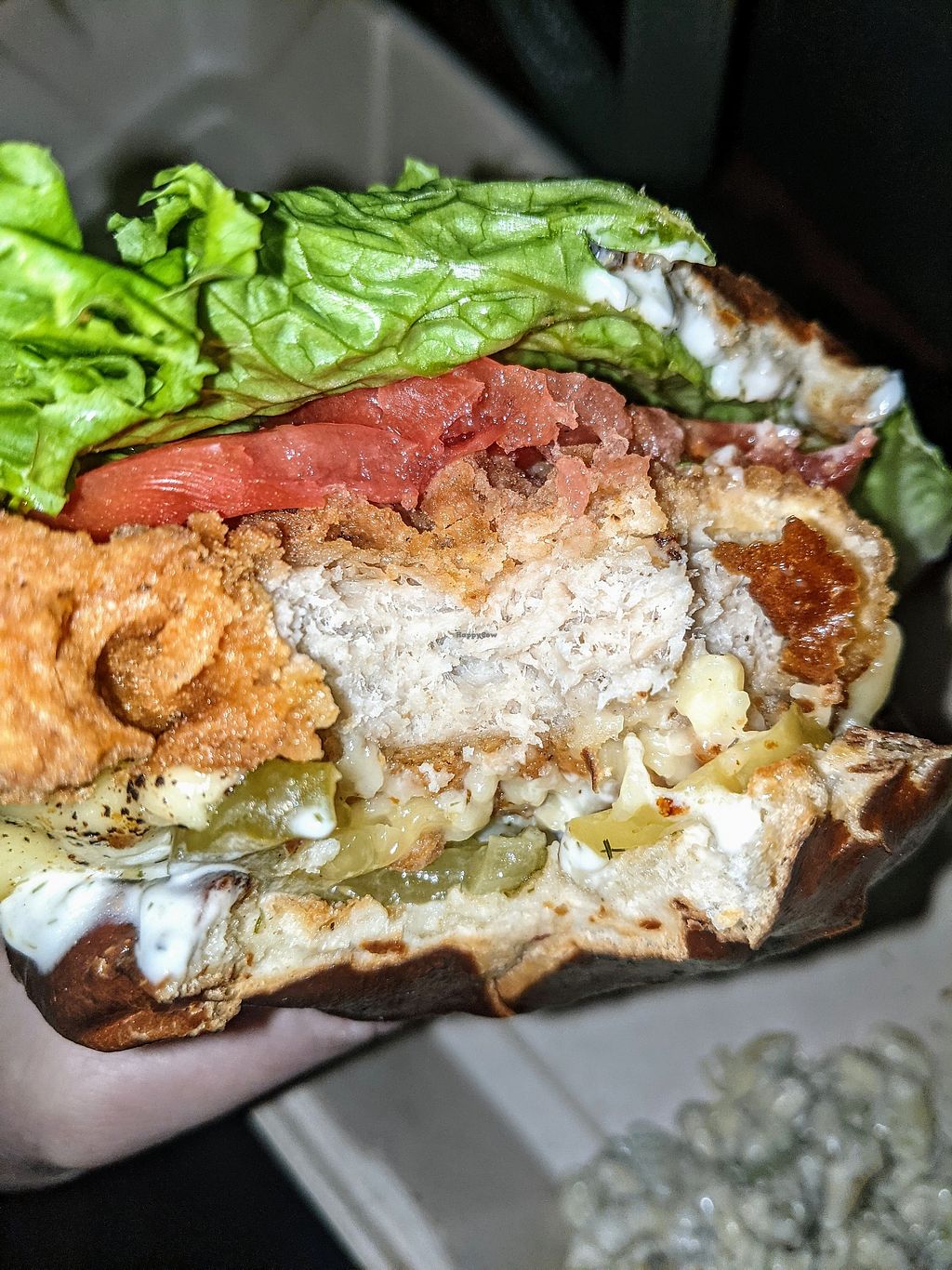 This is the third time I've eaten here. Today, I ordered the Original Sando, which is fried chicken, lettuce, tomato, pickles, and mayo. I did not want tomato, but the online ordering did not allow notes. There was way too much mayo. The chicken has a good consistency, but no flavor other than fried oil. Conversely, the fries were well-seasoned, but a mix of soft and crispy, which was slightly off-putting. I want to support vegan businesses, but this food disappoints me.