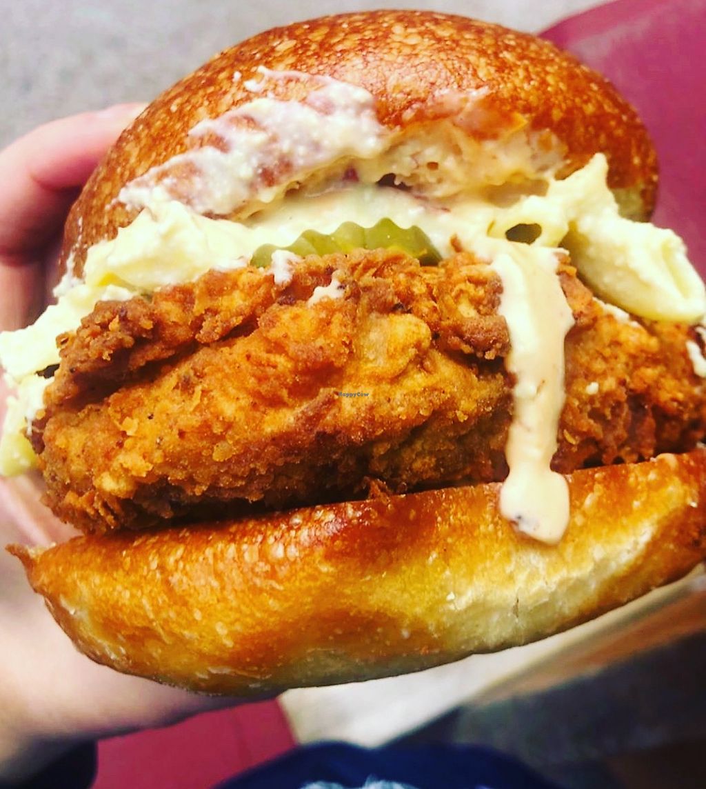 I'm always surprised Portland doesn't have more vegan fried chicken, so definitely happy to have The Mocking Bird in town. I got the standard chicken sandwich with cheese, and it was quite tasty! Chicken was the perfect texture for me -- firm, but not spongy. The mac n cheese was also quite good. Highly recommend this place!
