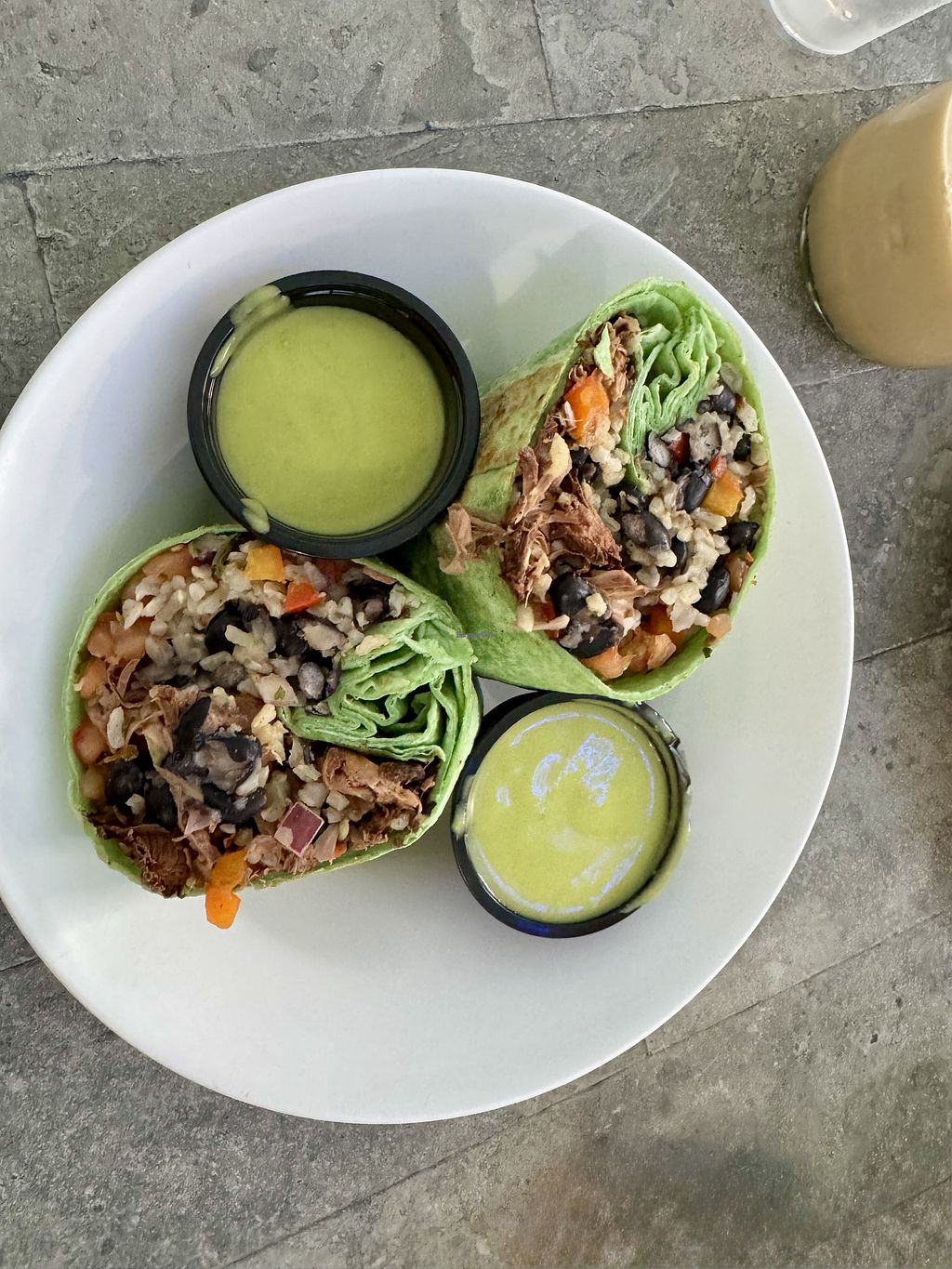 Jackfruit burrito with avocado crema (vegan) instead of ranch