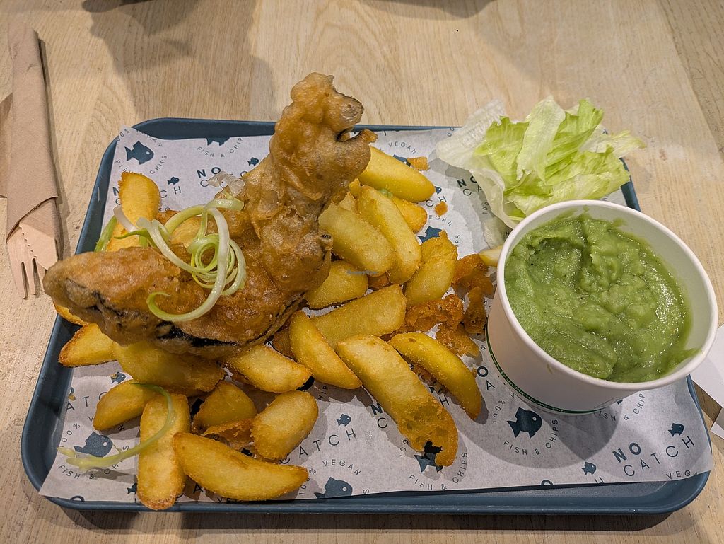 Good portionsize, tasted incredible and not too fishy as fake fish from the supermarket does. Was very happy to be able to try one of Englands staple foods.