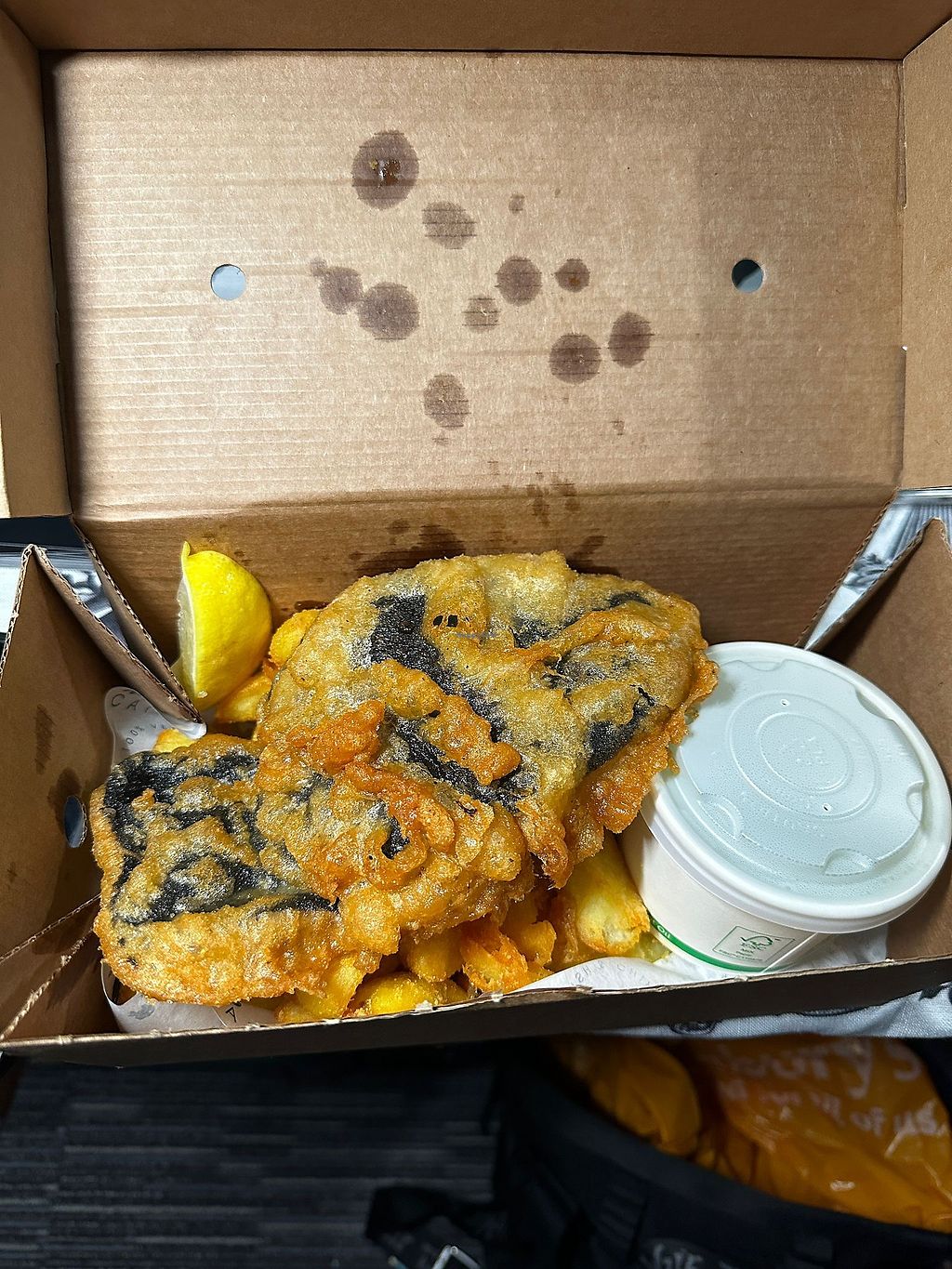 both portion of chips had a lot of just crisped bits of chips that were very oily and seemed to add nothing to the meal other than adding to the weight to make you think you are getting a good portion size..we had paid extra for large meals and I felt ripped off by this. They only give a lemon slice for seasoning.No salt and vinegar for Deliveroo order so you cant even try to cover the grease taste.