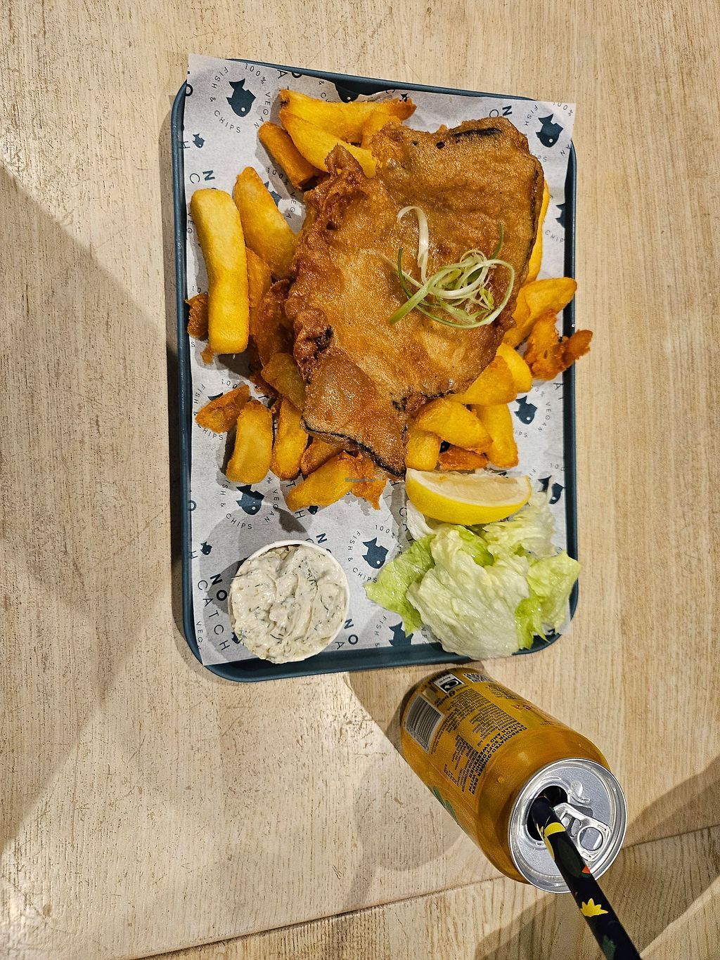 Cod and chips with tartarsauce and ginger beer