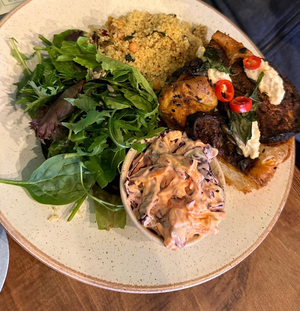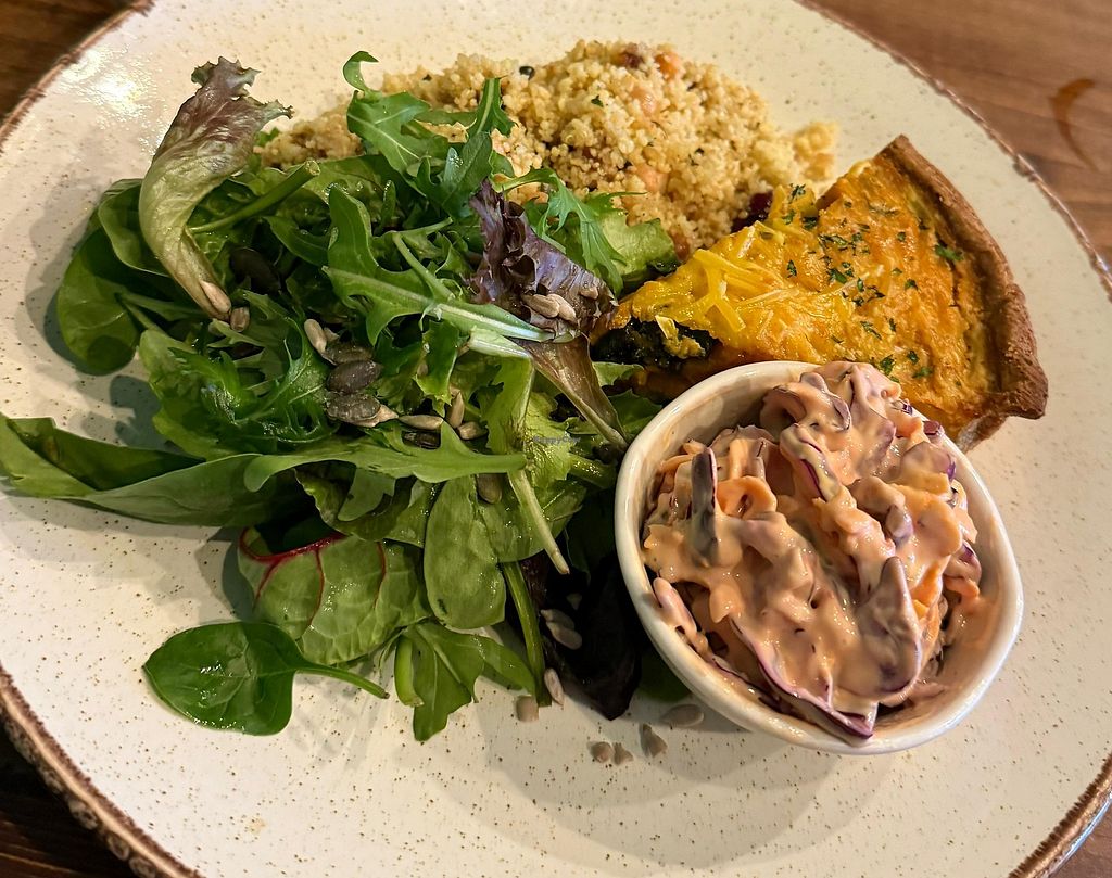 Lunch special warm pie with leaves and quinoa salad and coleslaww