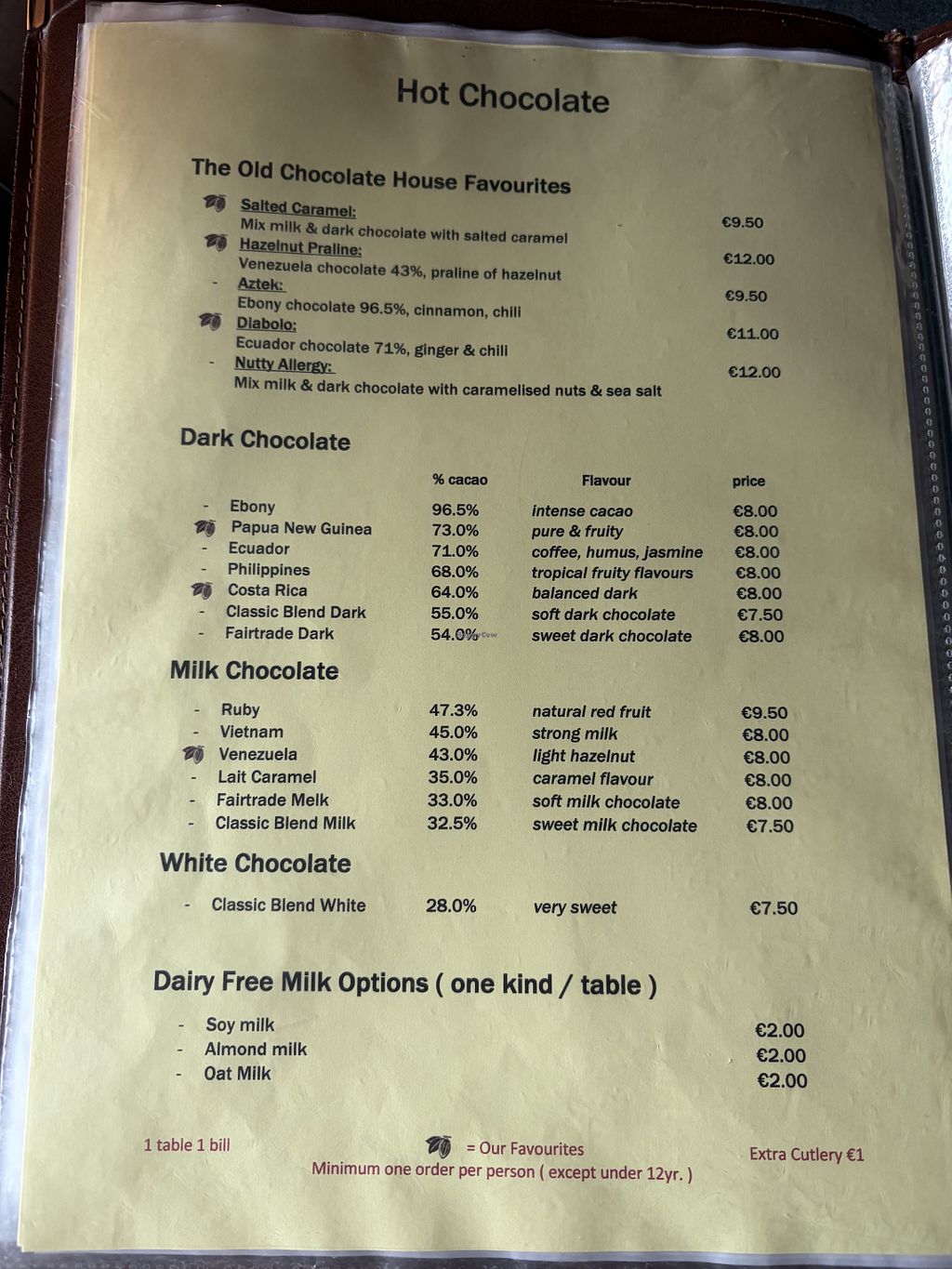 50-ish% (sweetest option) dark chocolate 8€ + oat milk 2€ (🙄)