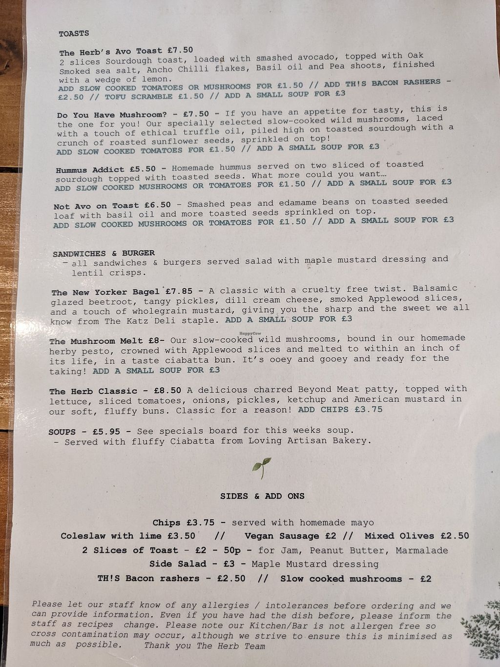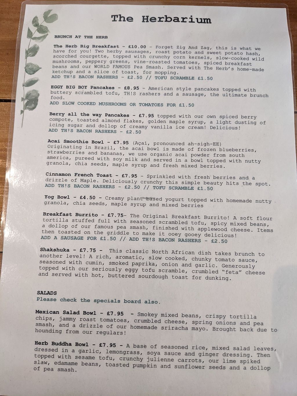 Vegetarian café serving big plates, bowls, burgers, toasts & flatbreads, pancakes and sides. Vegan options are clearly marked. Previously known as The Herbarium. Reported to be vegetarian October 2025, despite being fully vegan before. Open Mon-Wed 09:00-16:00, Thu-Fri 09:30-21:00, Sat 09:00-16:00, Sun 10:00-16:00. Also has an evening menu on Thursdays and Fridays from 4-8:30pm, booking recommended.