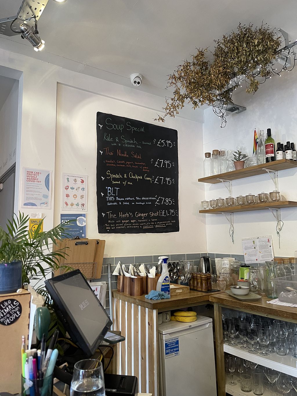The food menu has a good range of staples (hummus, mushrooms on toast, breakfast) with a few dishes that change to keep things interesting. The soups are always great.