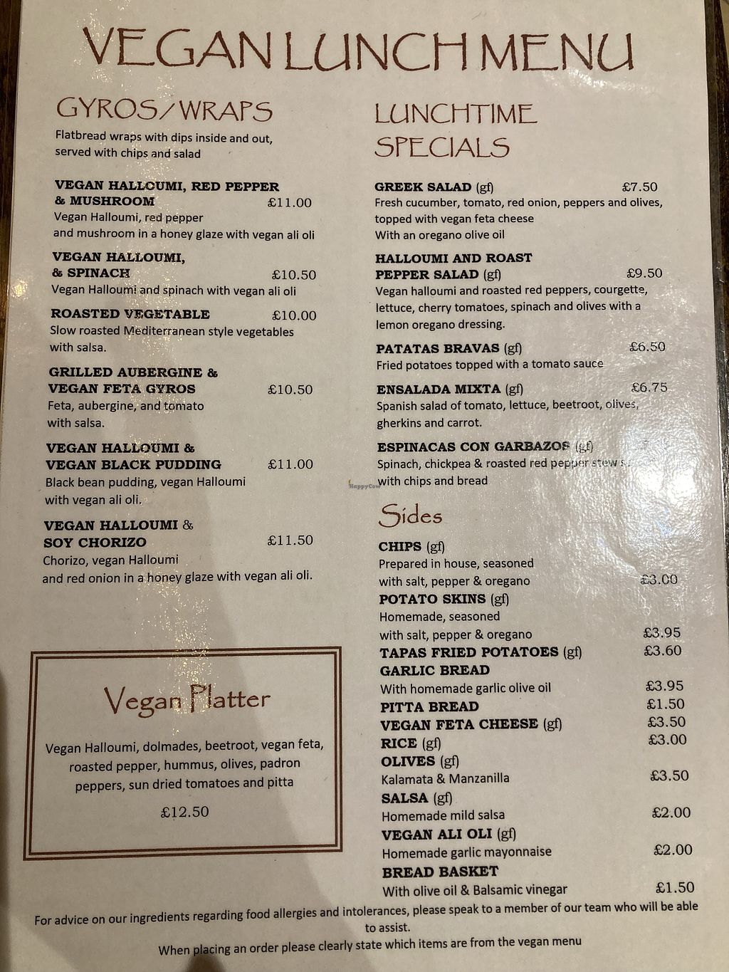 Read moreThey have a separate vegan menu which has many of their staples made vegan. They have a range of tapas options, vegan gyros, platters and larger plates.
