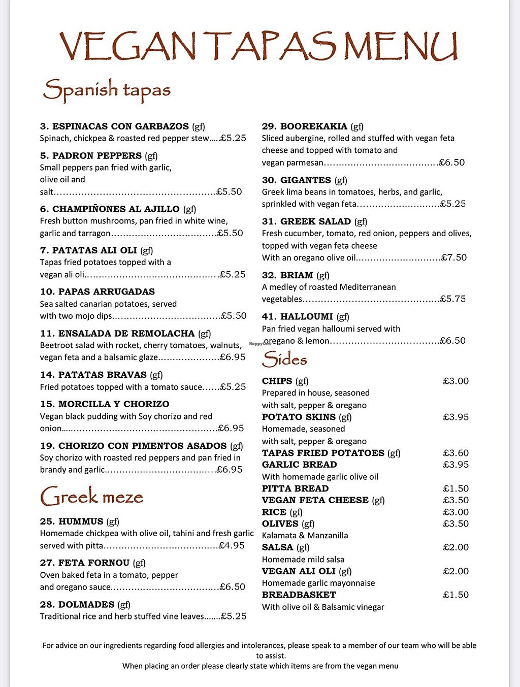 Read moreThe Old Yard Tapas Bar was sporting a tempting Spanish Tapas and Greek Meze Vegan Dinner Menu so gave it a bash.