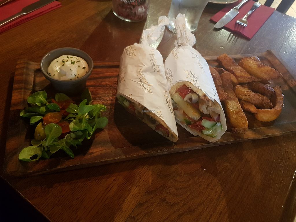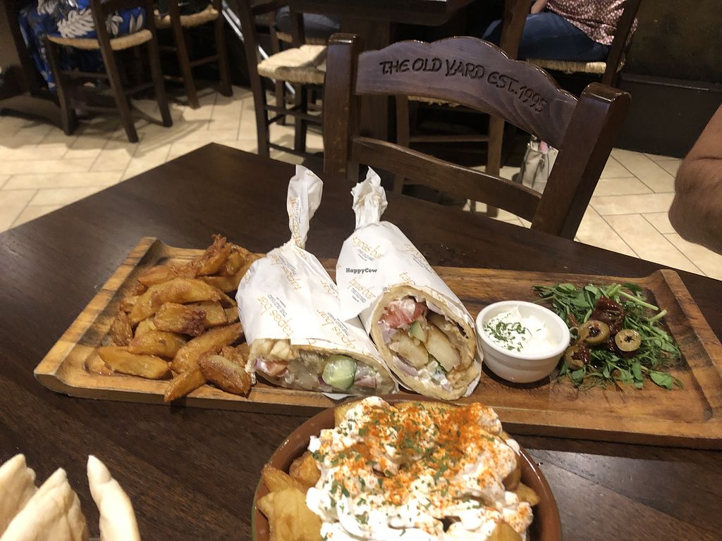 Read moreI had a vegan halloumi and chorizo gyros wrap. It came on a huge wooden board with potato wedges, salad and garlic mayo - a huge portion. The halloumi wasn't great and the whole thing was a bit too sweet and greasy, but it was very filling.
