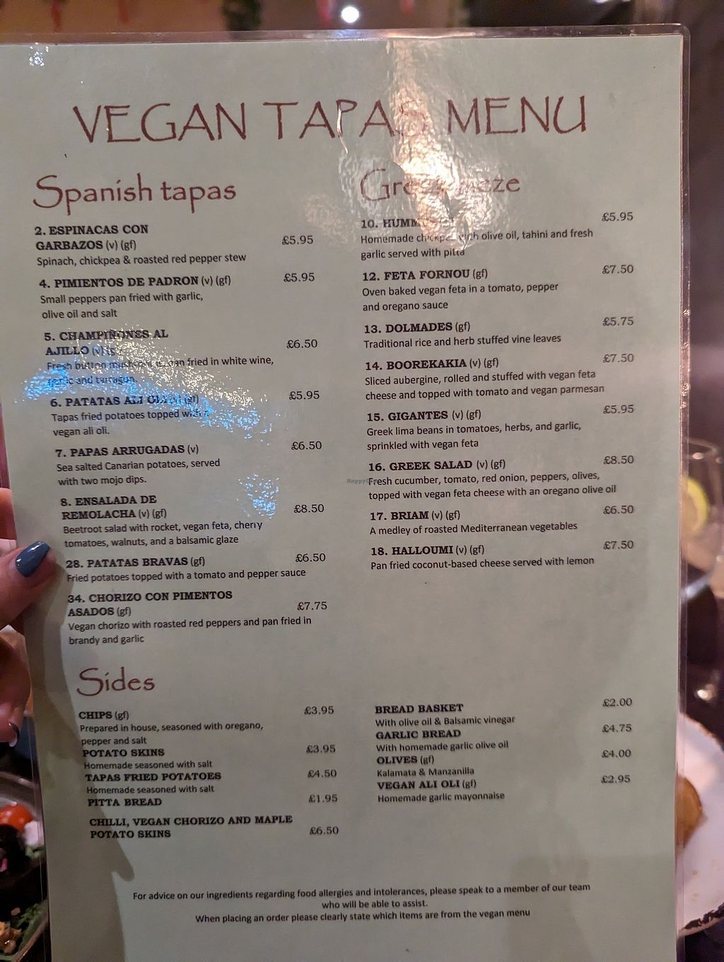 They had a separate vegan lunch & tapas menu with loads of different options. One of the tapas dishes was vegan black pudding and chorizo, it was really tasty. They also had small bottles of vegan (labeled) prosecco which was a nice treat!