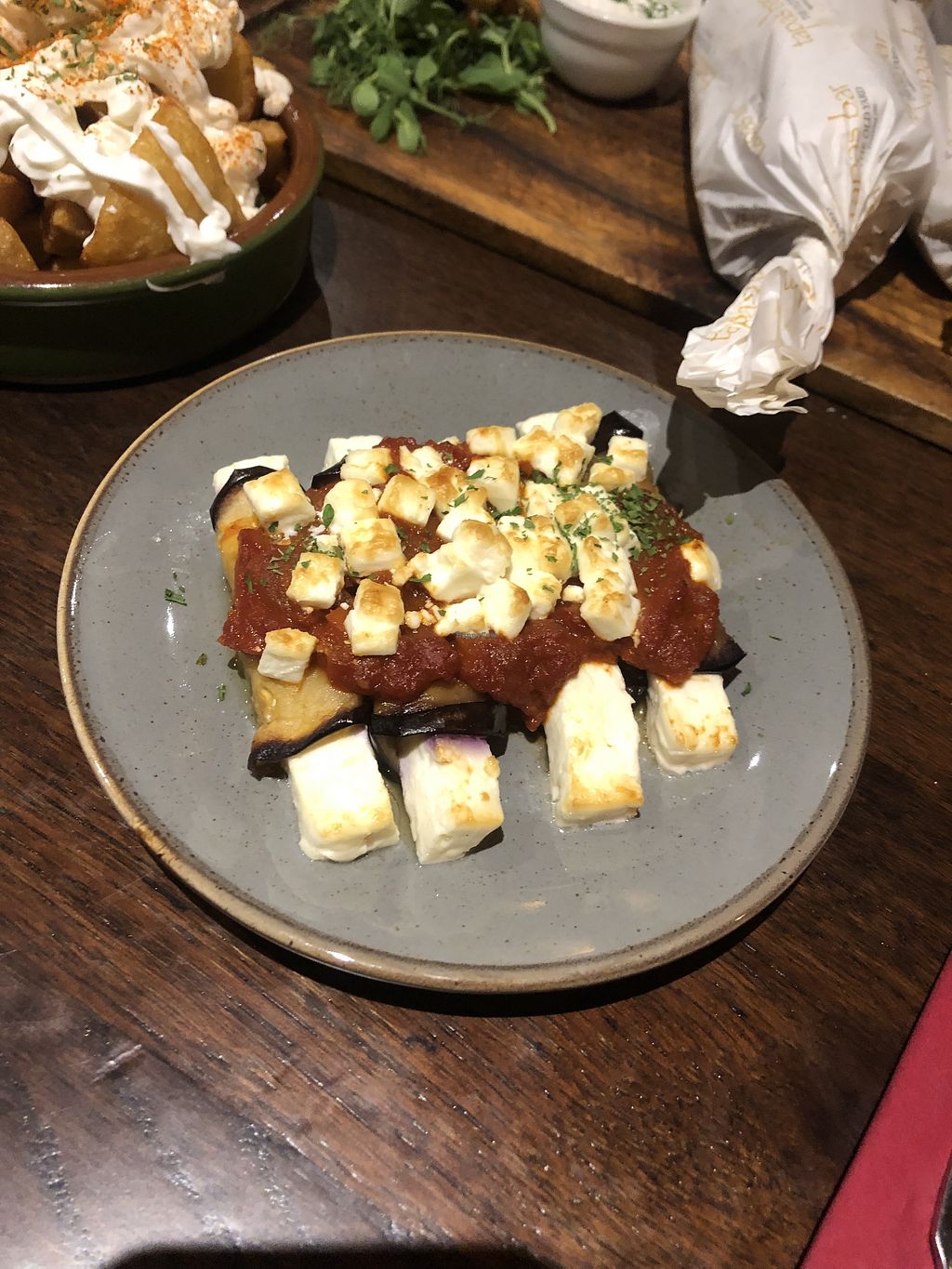 I had the hummus and pitta which was lovely - really creamy and full of flavour. I had the patatas aioli which was incredible and my favourite was the borakakia (aubergine wrapped feta topped with marinara sauce). This is a dish I’ve had in Greece many times prior to being vegan, and I never thought I’d get anything close. Genuinely just closed my eyes and enjoyed it!