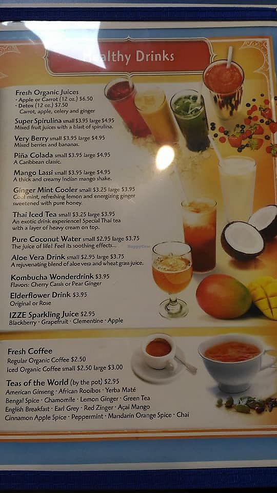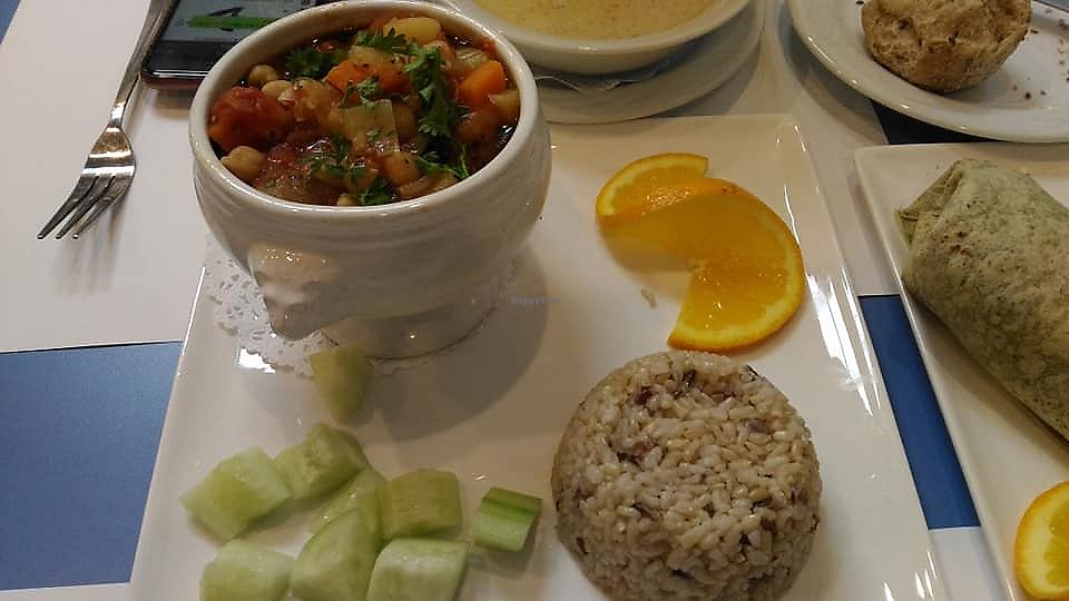 There are so many choices on their menu that I wanted to try that I had a hard time choosing. What I did choose, the Souvlaki was really good. I also had the "Magic Mushrooms" which was a nice, simply flavored appetizer. All he flavors were fresh and clean and not too overpowering. My friend had the Thai Chicken Wrap, which I tried and it was delicious. Their menu is international, which is a treat when considering that many vegetarian options in the area tend to be Chinese or Indian in influence. The decor is bright, clean and calming. When it came to the prices i was very happy. The Entree averaged about $10.50 and Apps around $4. great prices! Lunch prices were even cheaper. I plan to go again and try other items, maybe even dessert. There are many Vegan items and some dishes that can be "veganized" are clearly marked.