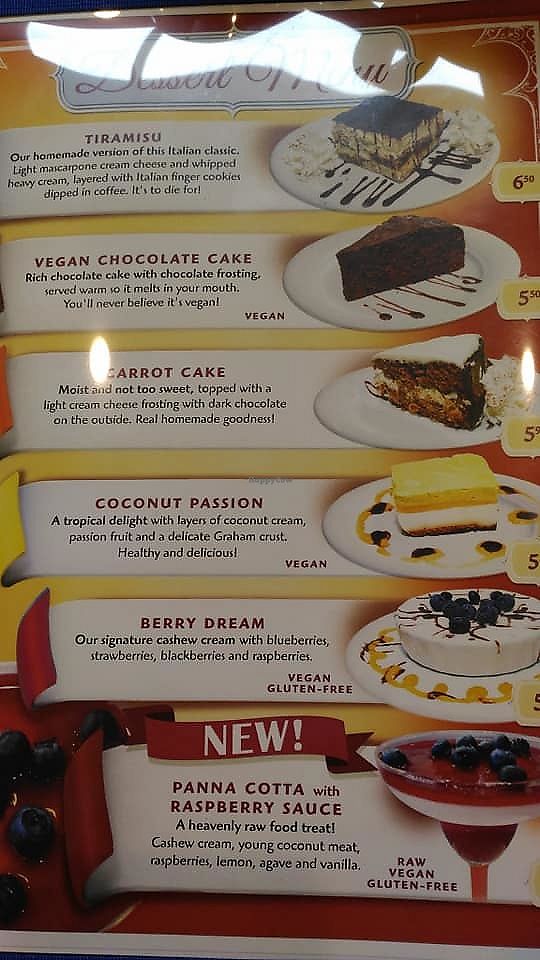 Not a very big menu. Some dishes vegan some not, but what is vegan is very good. Very nice atmosphere. Worth taking a trip to. Very good soups also. Portions medium not big but enough for a meal. Prices ok.