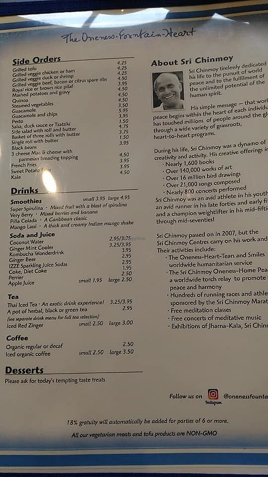 I have been an ethical vegan since 2007 and have recently resumed eating a gluten-free diet. I have been going to The Oneness Fountain Heart pretty regularly since 2009 and can attest to the quality of food, cleanliness, and peaceful atmosphere. All of these qualities contribute to a delightful culinary experience, designed to appeal to all of your senses, which doing so with a clean conscience!!! As they are both vegetarian and vegan, I can tell you that the management at Oneness is very aware and accommodating of its clientele. I highly recommend.