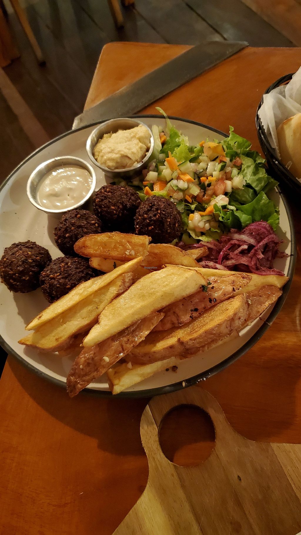 Indoor /Outdoor seating. Several vegan options. We ordered the falafel and vegan burger. Both came with fries.