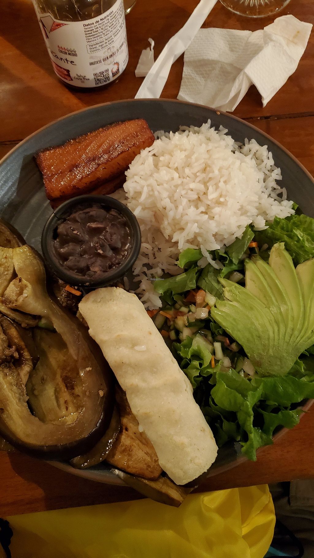 I thought the food here was pretty good! A bit pricier than the local food but worth the ambiance and open late. I ordered a vegan casado, which was good except for the big pieces of bland eggplant that came with it. I also got a delicious banana dates and cacao smoothie. My husband got the falafel platter which was great.