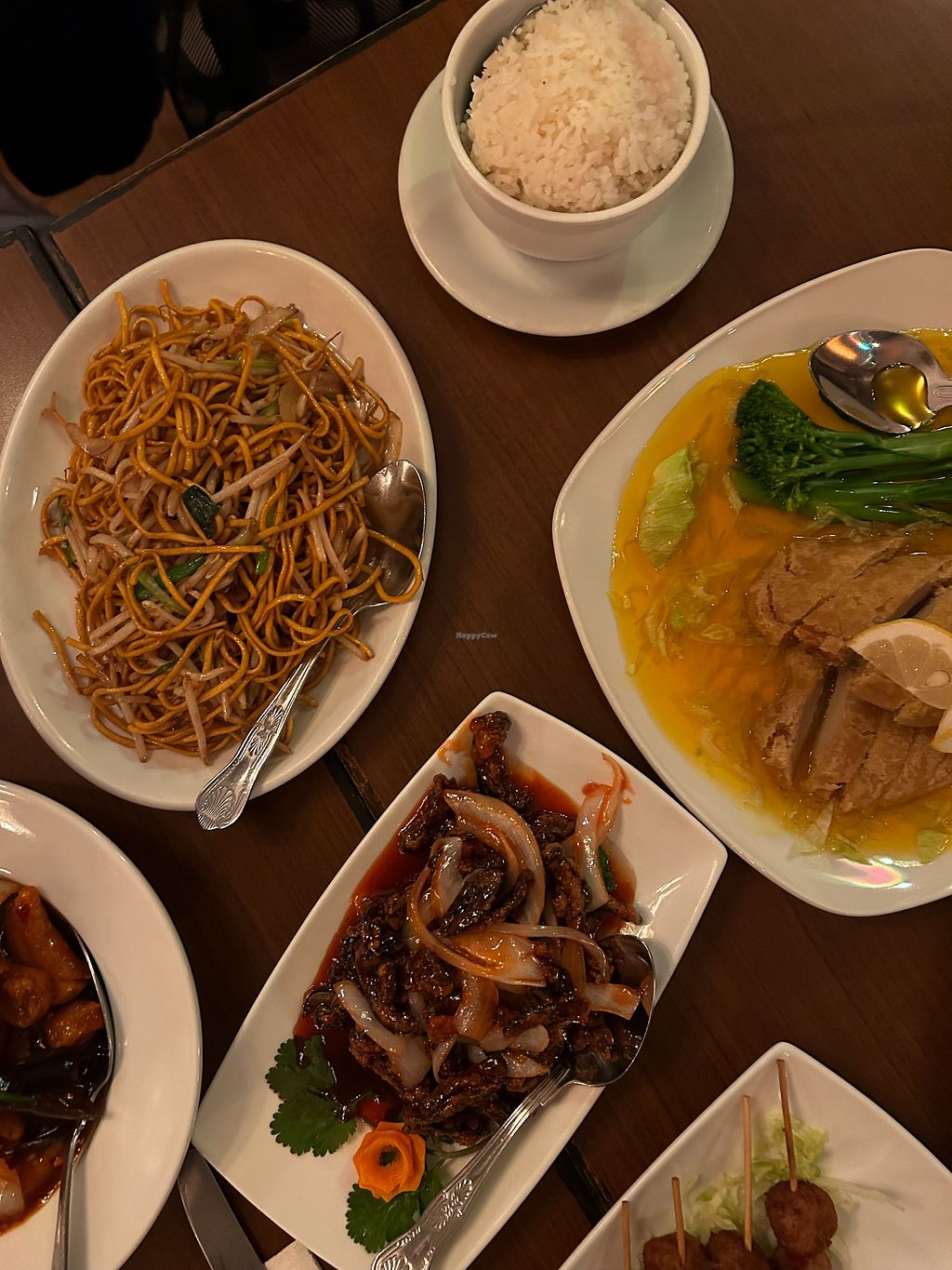 Steamed Jasmine Rice, Fried Noodles, Lemon Vegan Chicken, and Crispy S…