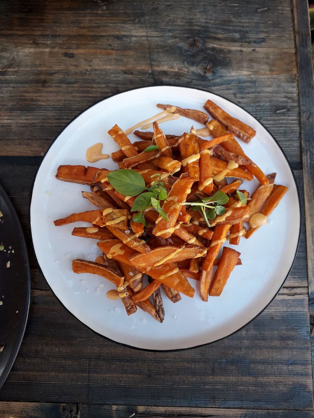 Very nice and perfect tempeh wrap with lots of organic ingredients (incl. wrap in red colour, I suppose that beetroot juice was added to it), crispy sweet potato fries, nice chili dip