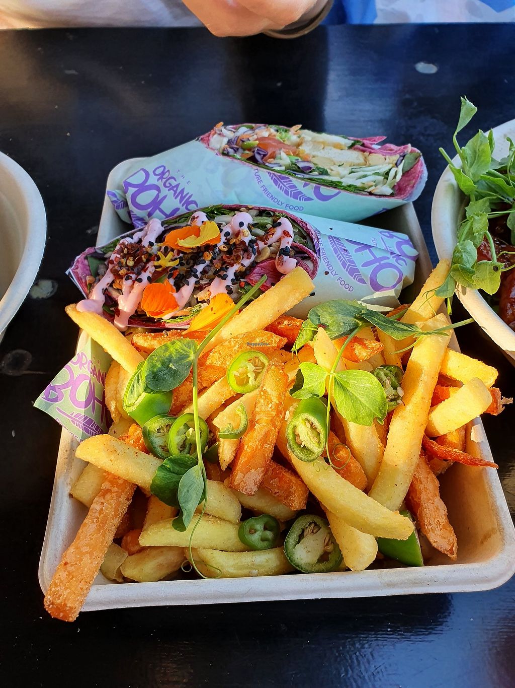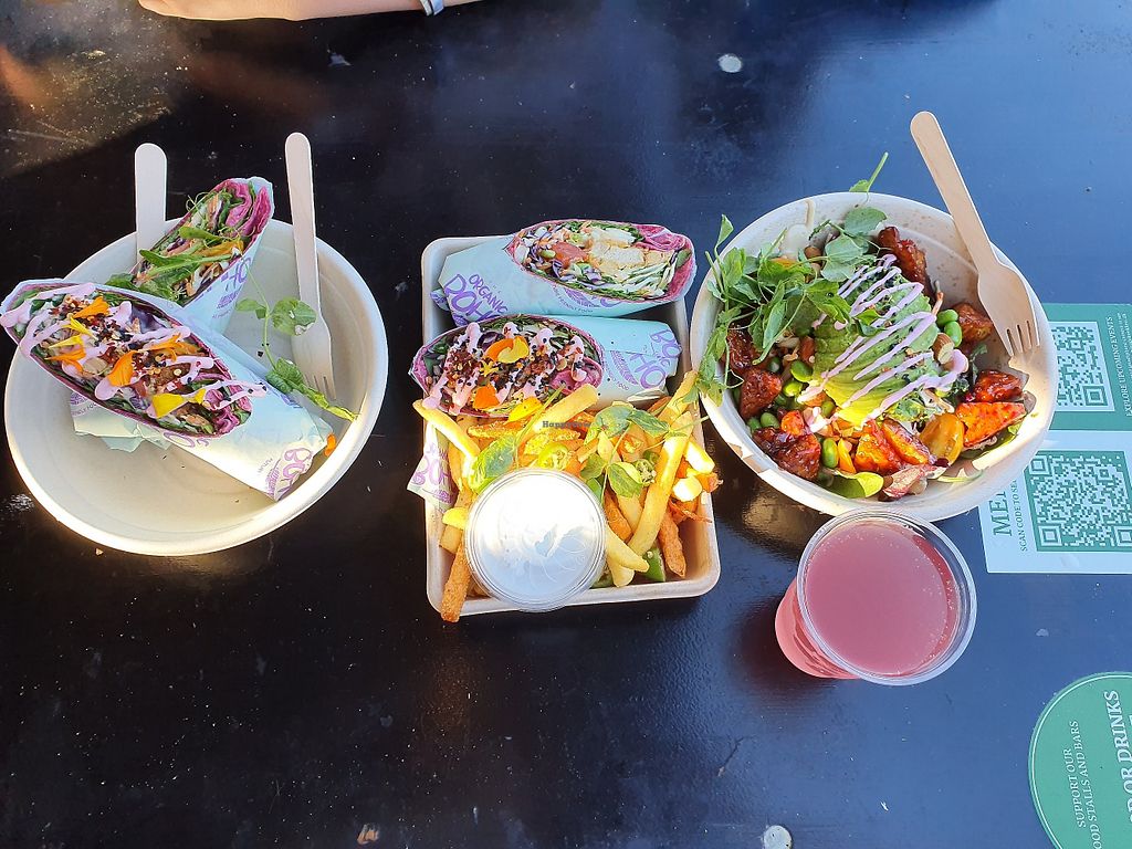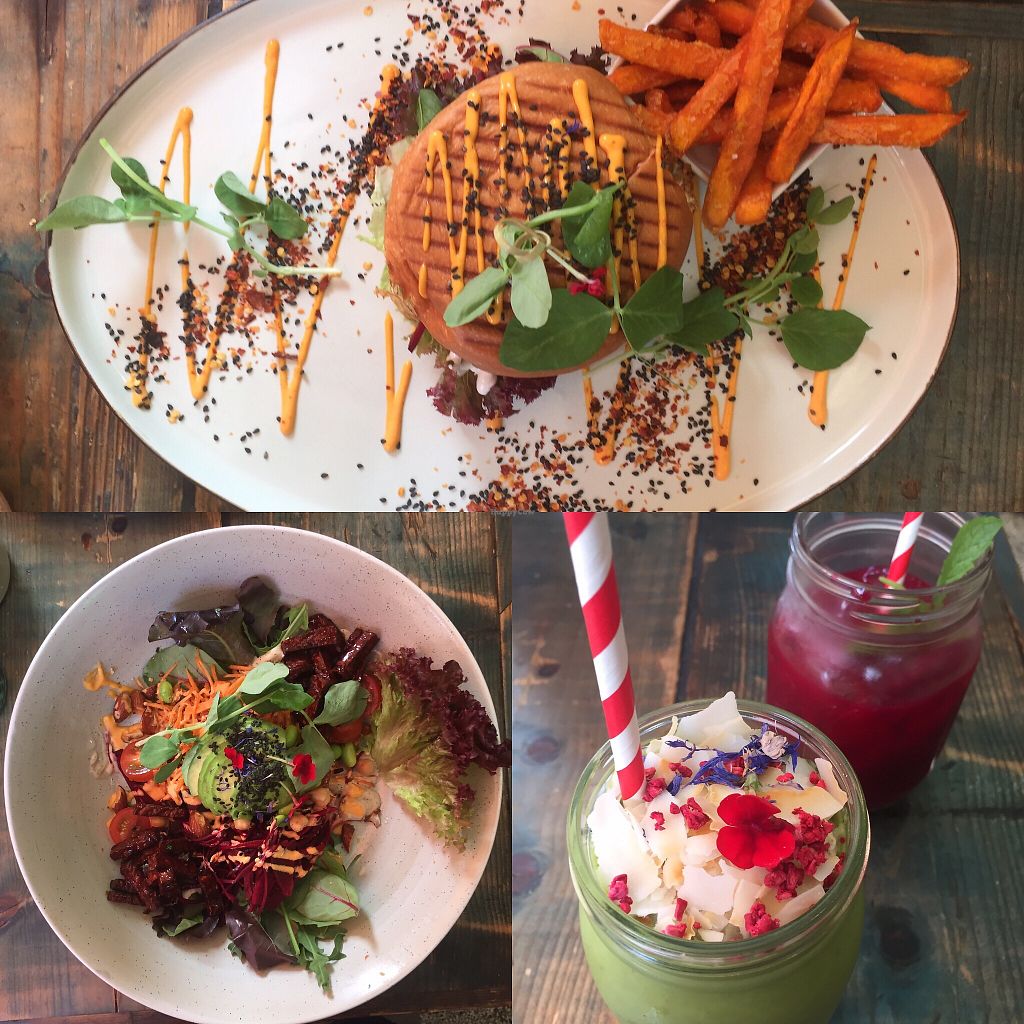 Tempeh burger and falaffel. "I am Joyful" smoothie and "I am glowing" …