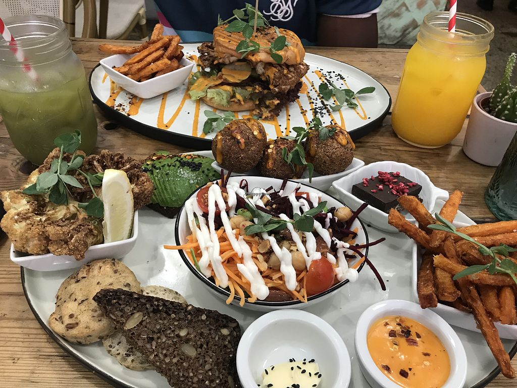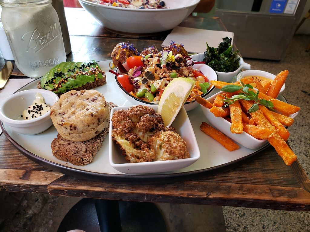 Cauliflower burger and love platter with juices.