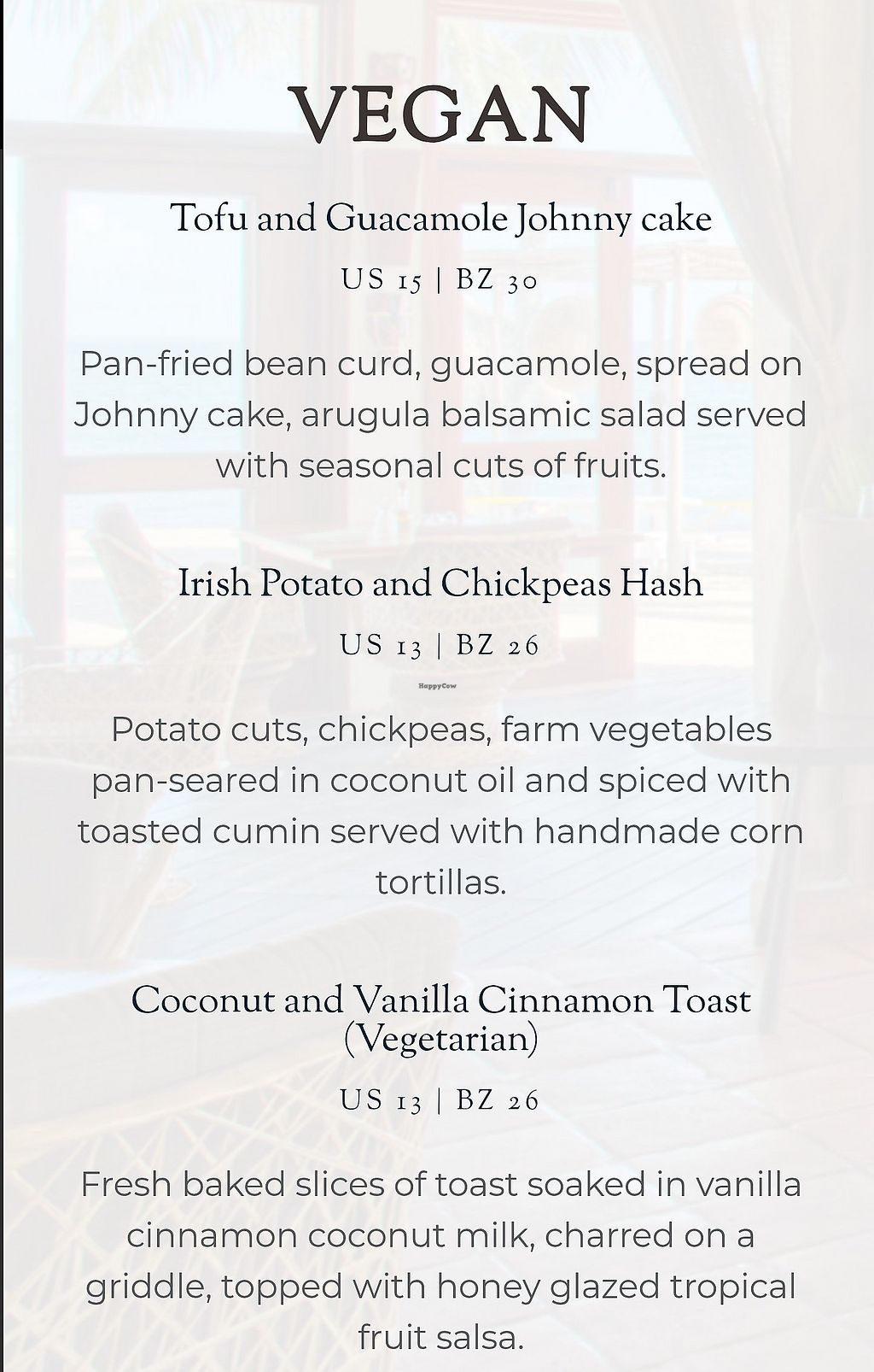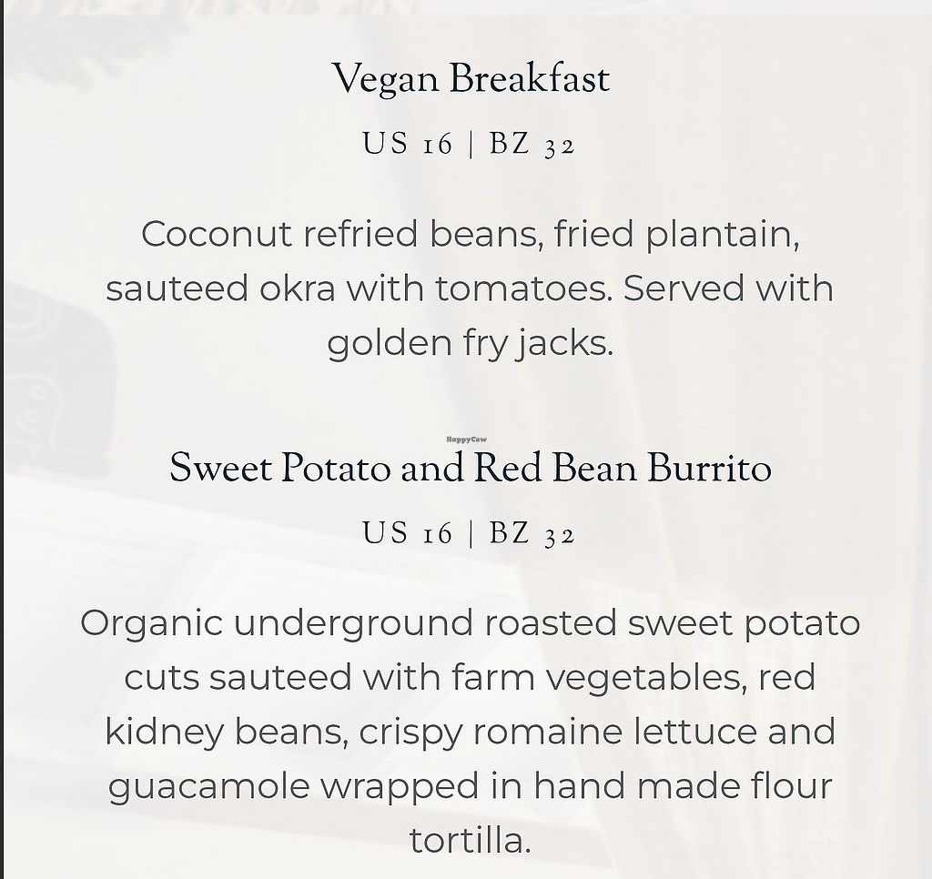 Serves meat, vegan options available. The restaurant offers breakfast vegan choices which may include tofu & guacamole Johnny cake, Irish potato & chickpea hash, coconut & vanilla cinnamon toast. Also has a 'vegan breakfast,' sweet potatoes and a red bean burrito. The vegan breakfast and sweet potatoes and red bean burrito. Open Mon-Sun 6:30am-9:30am, 12:00pm-3:00pm, 6:00pm-9:00pm.
