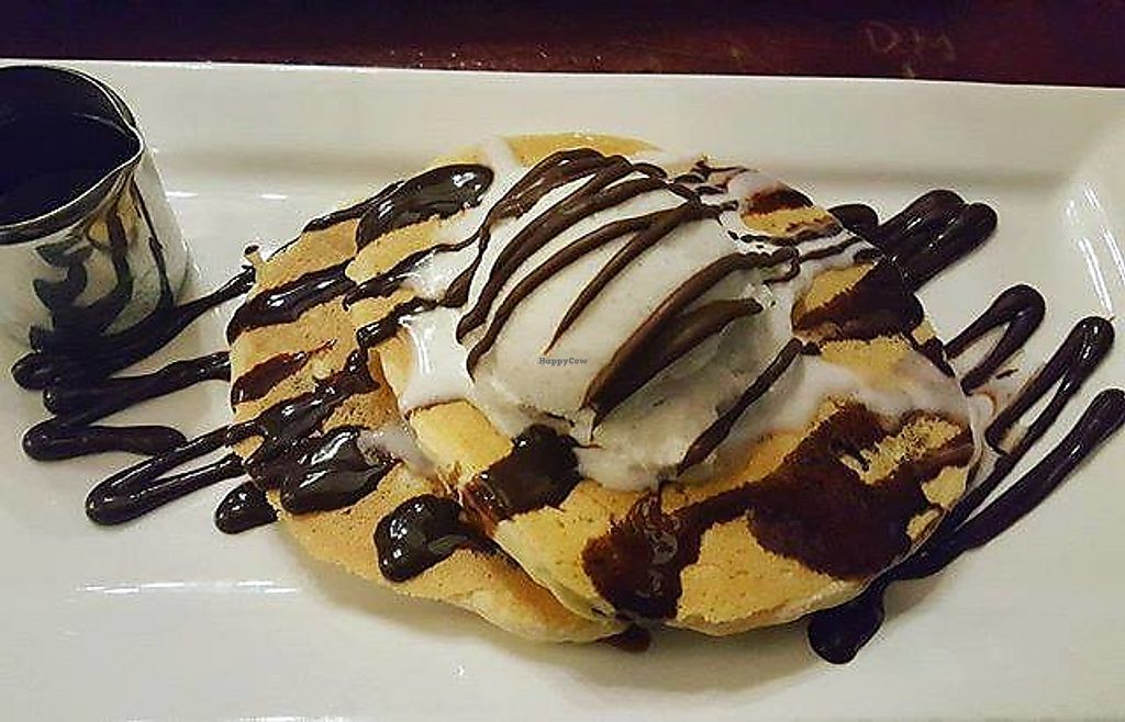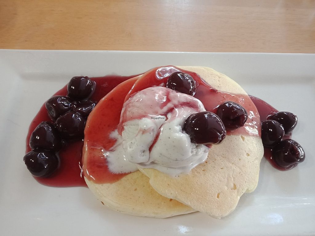 I found that there are about 5 different flavours added to the pancakes that are Vegan. I had the Blueberry, but there is strawberry, apple and a couple of others I can't remember now. The pancakes were edible, if they were any softer you wouldn't be able to cut them (you'd need a spoon). You need to dip the pancake into the sauce before you eat them, if you feel they are too dry. You need to ask for the Vegan Ice-cream or they'll give you dairy ice-cream. We've been here several times before, as Vegans and also pre-Vegans and the service has been mediocre even though it wasn't busy. The table was missing forks so I had to ask for them.