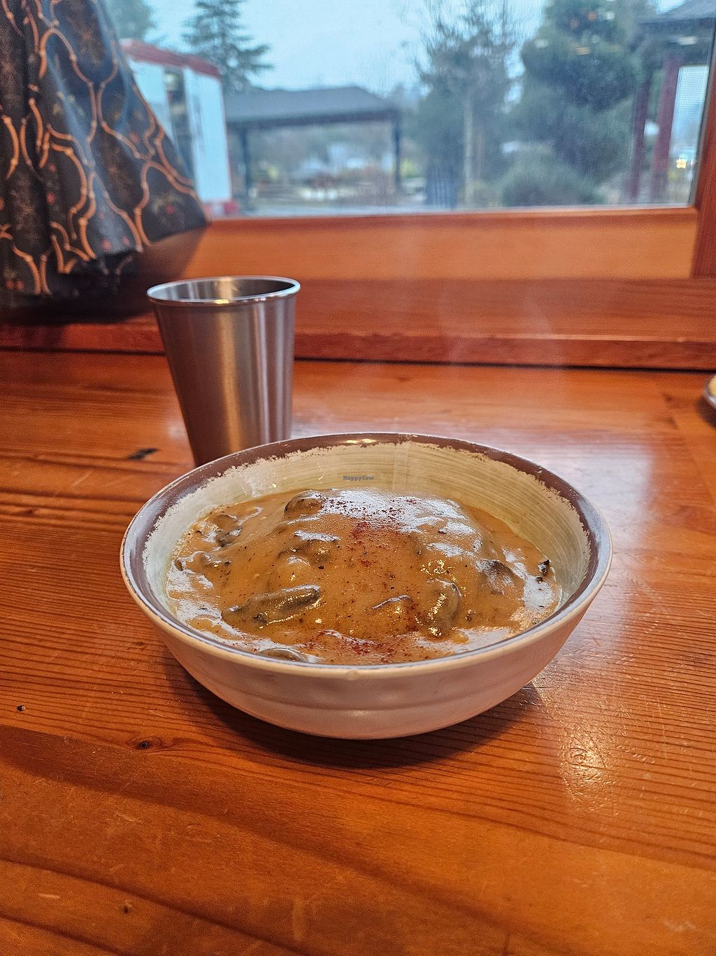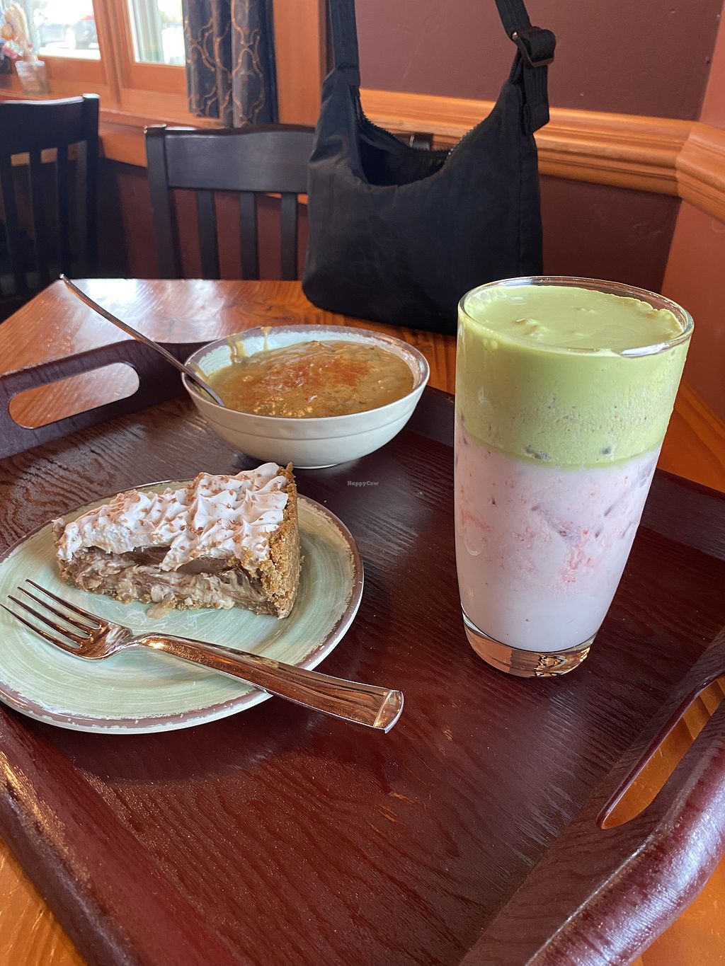 Mushroom gravy, German chocolate cake, matcha strawberry drink