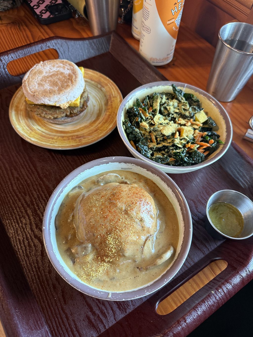 Breakfast sandwich, kale salad, biscuits and gravy