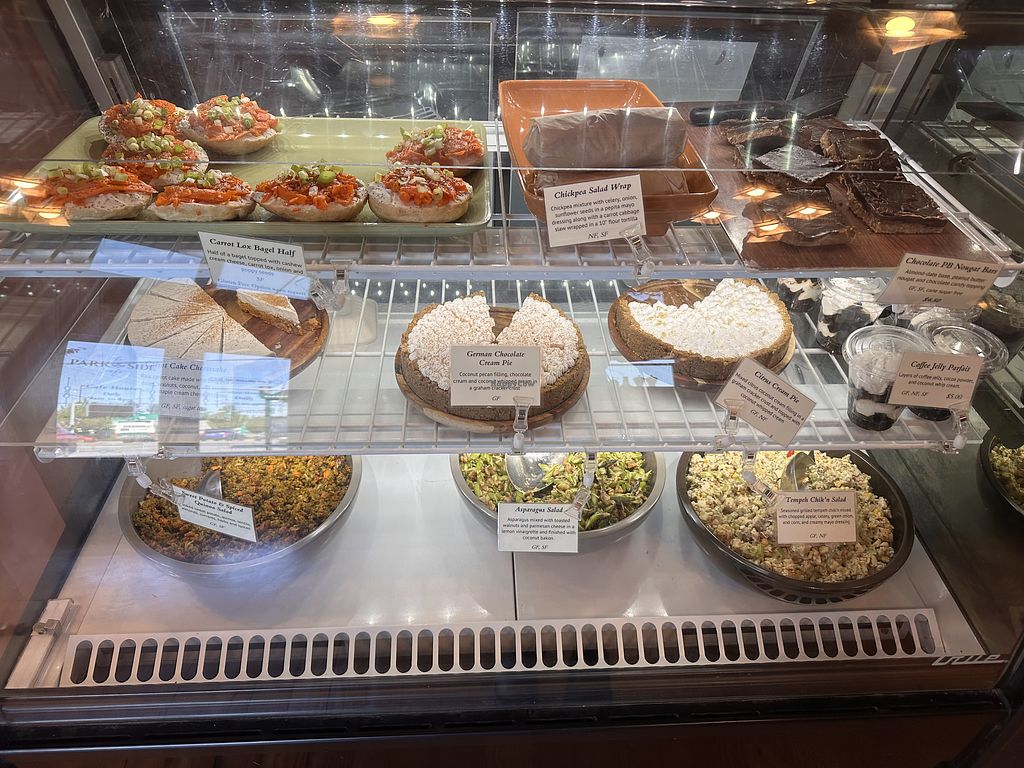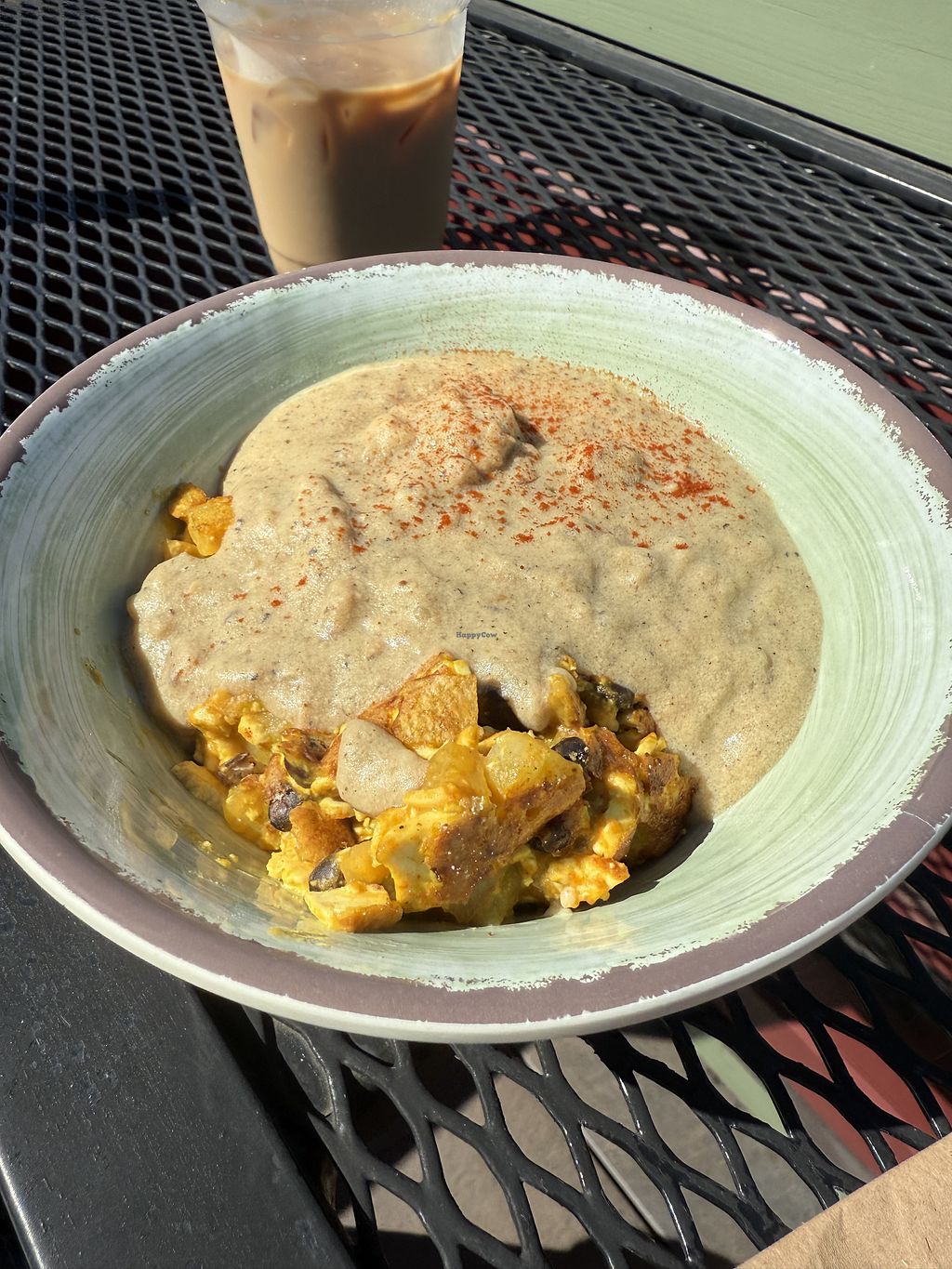Iced latte, iced chai, mac n potat salad, biscuit w/ gravy, tofu marin…