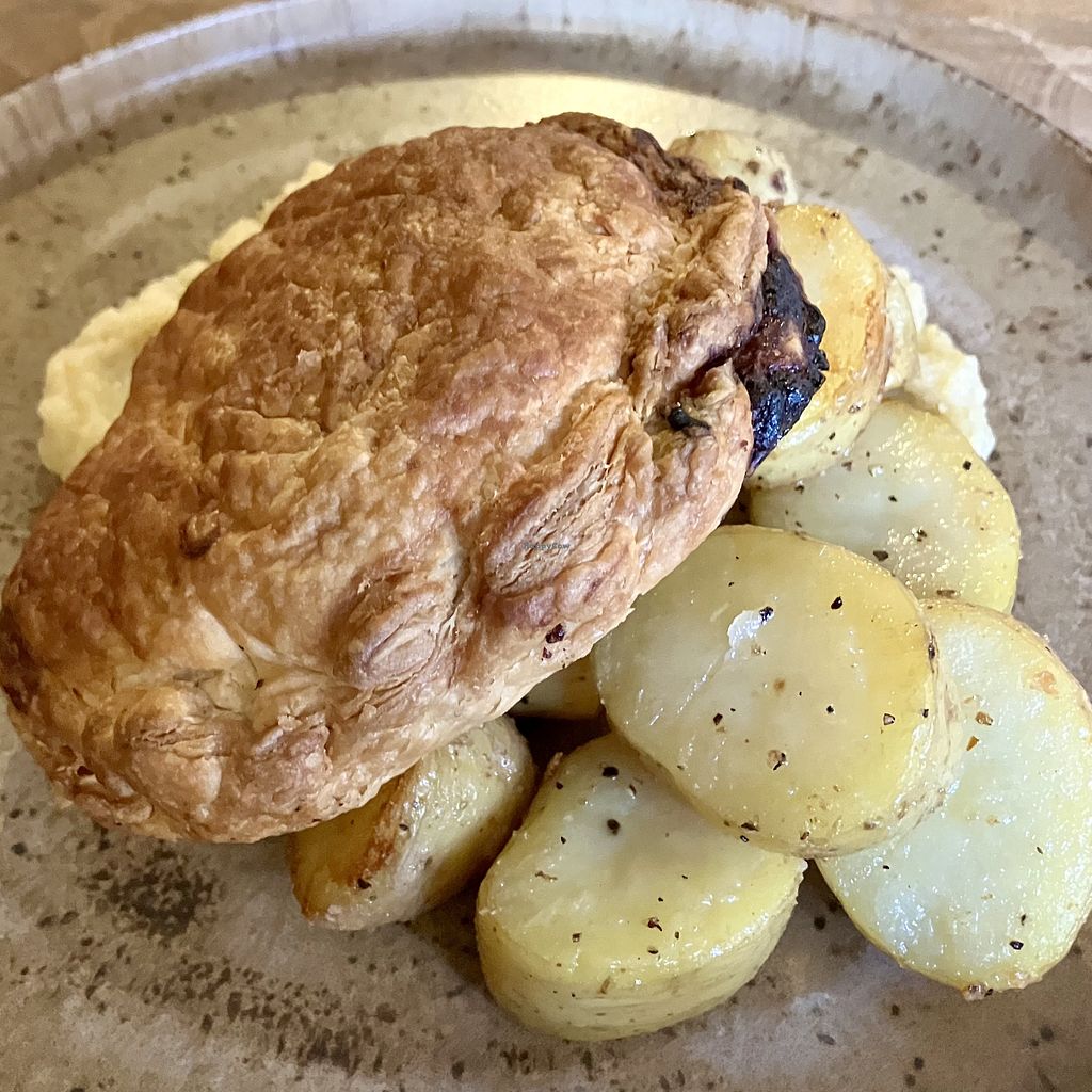 Spiced falafel burger topped with red pepper and chickpea hummus